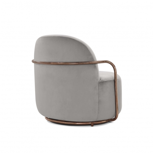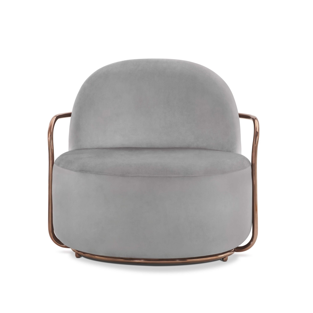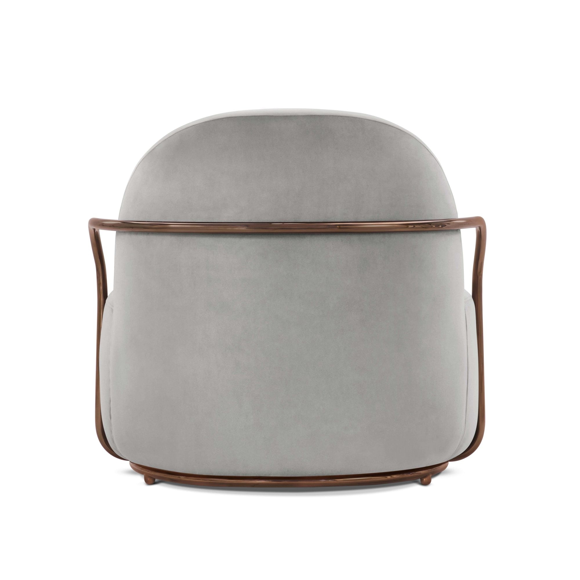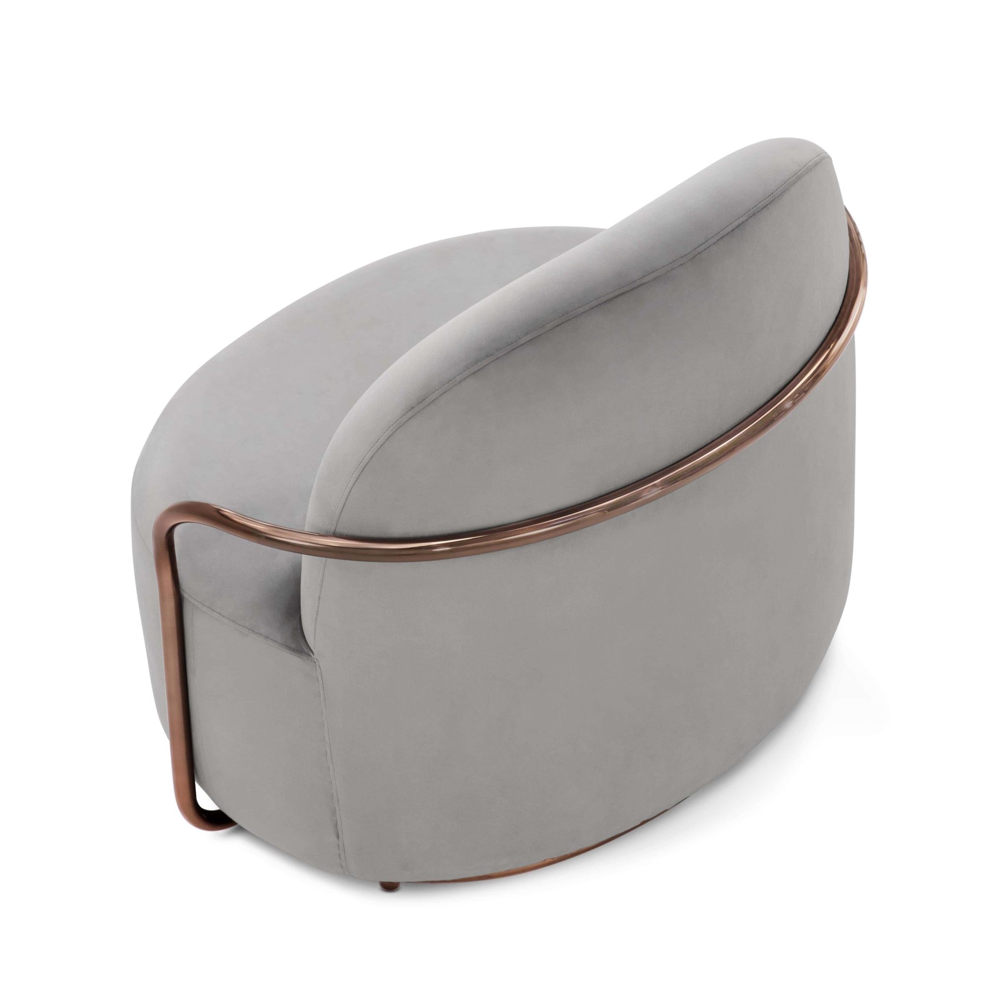 Orion lounge chair from 88 Secrets collection, 94 cm long. Emblem of the contemporary, Orion is a comfortable and welcoming seat, which surprises for its chic and glamorous graphic effect, but also for its unique comfort. It features a luxurious fabric upholstery and an elegant metallic finish that adds a sophisticated touch, enhancing any space. Designed by Nika Zupanc for Scarlet Splendour