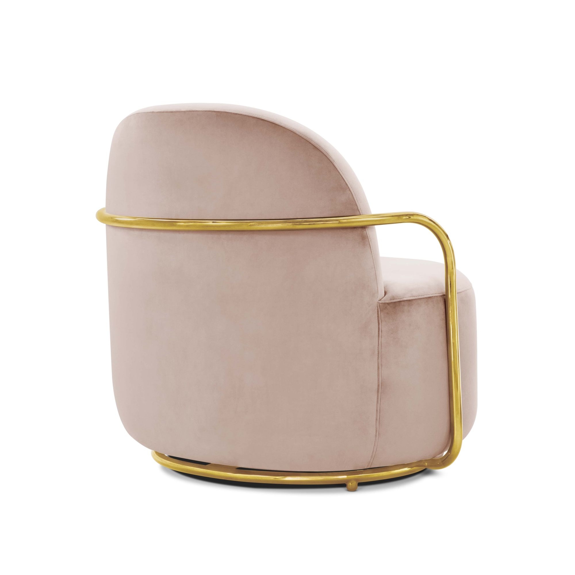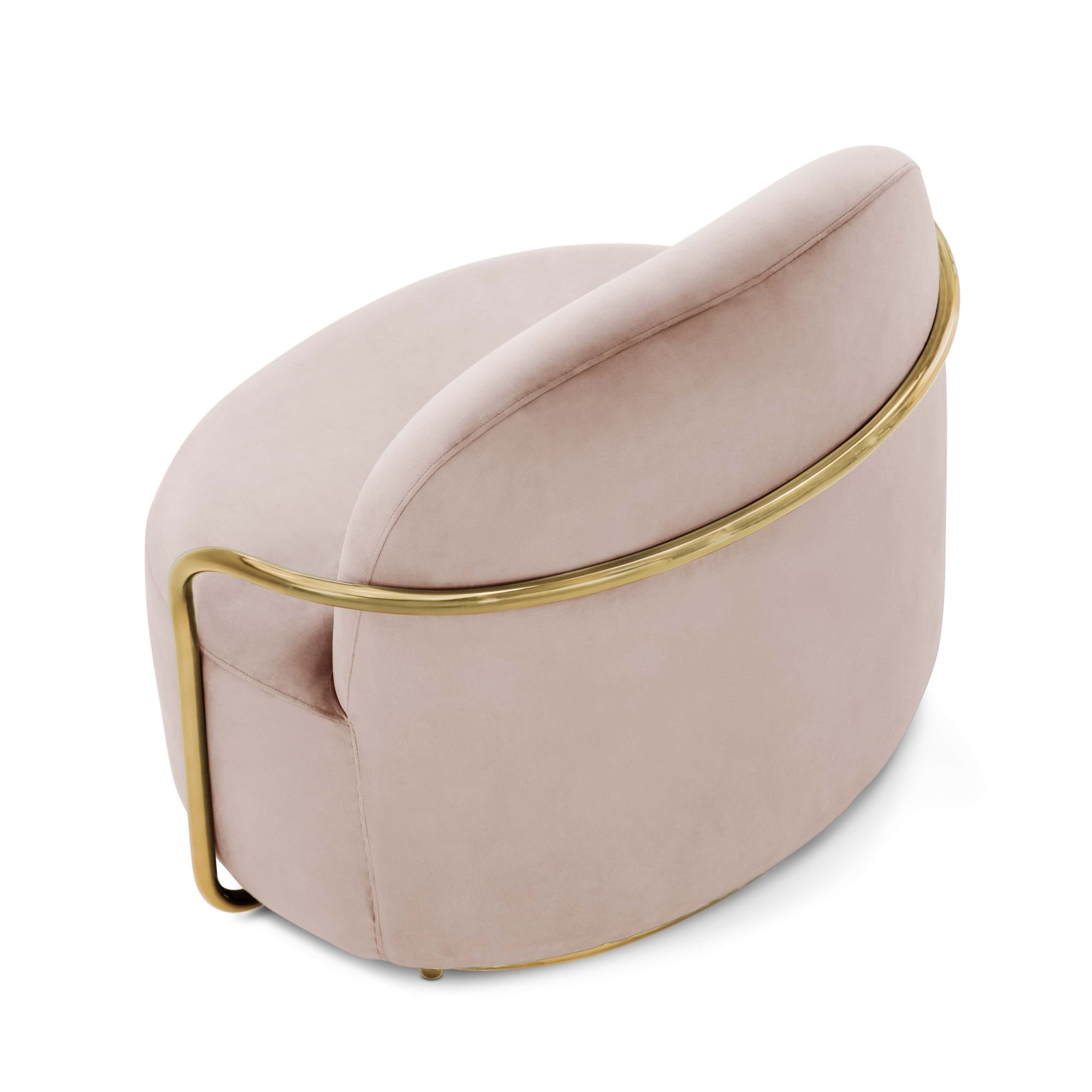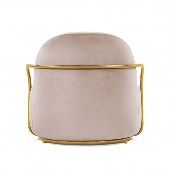Orion lounge chair from 88 Secrets collection, 94 cm long. Emblem of the contemporary, Orion is a comfortable and welcoming seat, which surprises for its chic and glamorous graphic effect, but also for its unique comfort. It features a luxurious fabric upholstery and an elegant metallic finish that adds a sophisticated touch, enhancing any space. Designed by Nika Zupanc for Scarlet Splendour