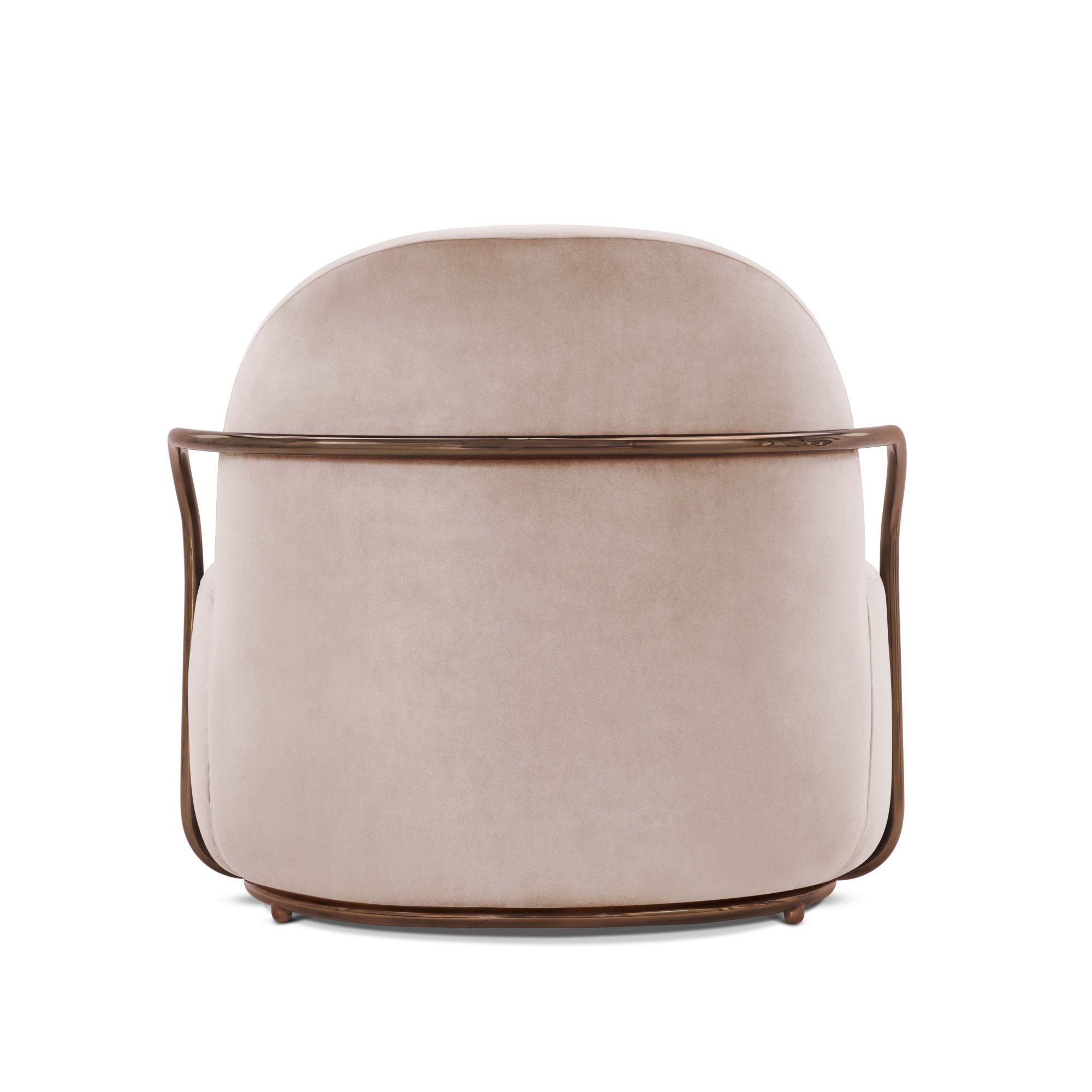 Orion lounge chair from 88 Secrets collection, 94 cm long. Emblem of the contemporary, Orion is a comfortable and welcoming seat, which surprises for its chic and glamorous graphic effect, but also for its unique comfort. It features a luxurious fabric upholstery and an elegant metallic finish that adds a sophisticated touch, enhancing any space. Designed by Nika Zupanc for Scarlet Splendour