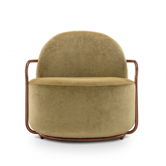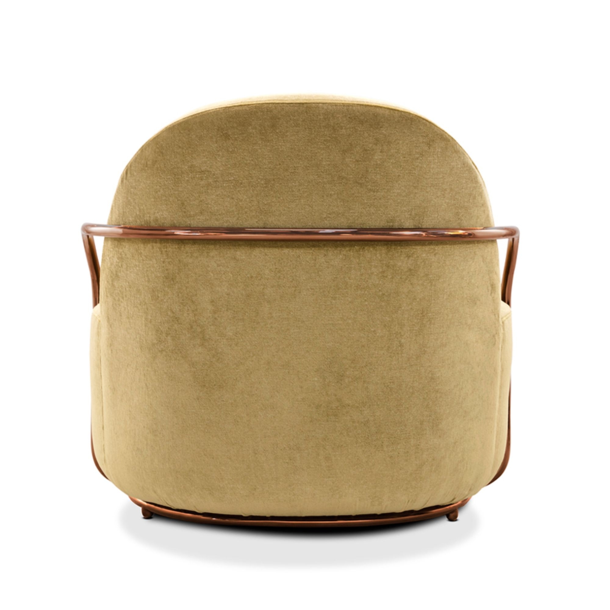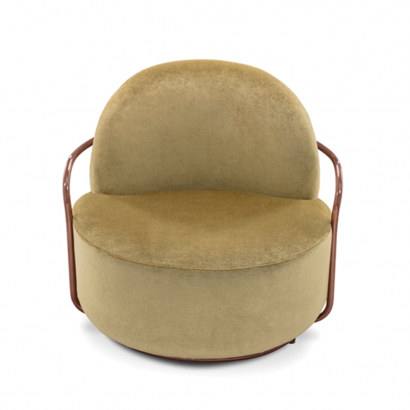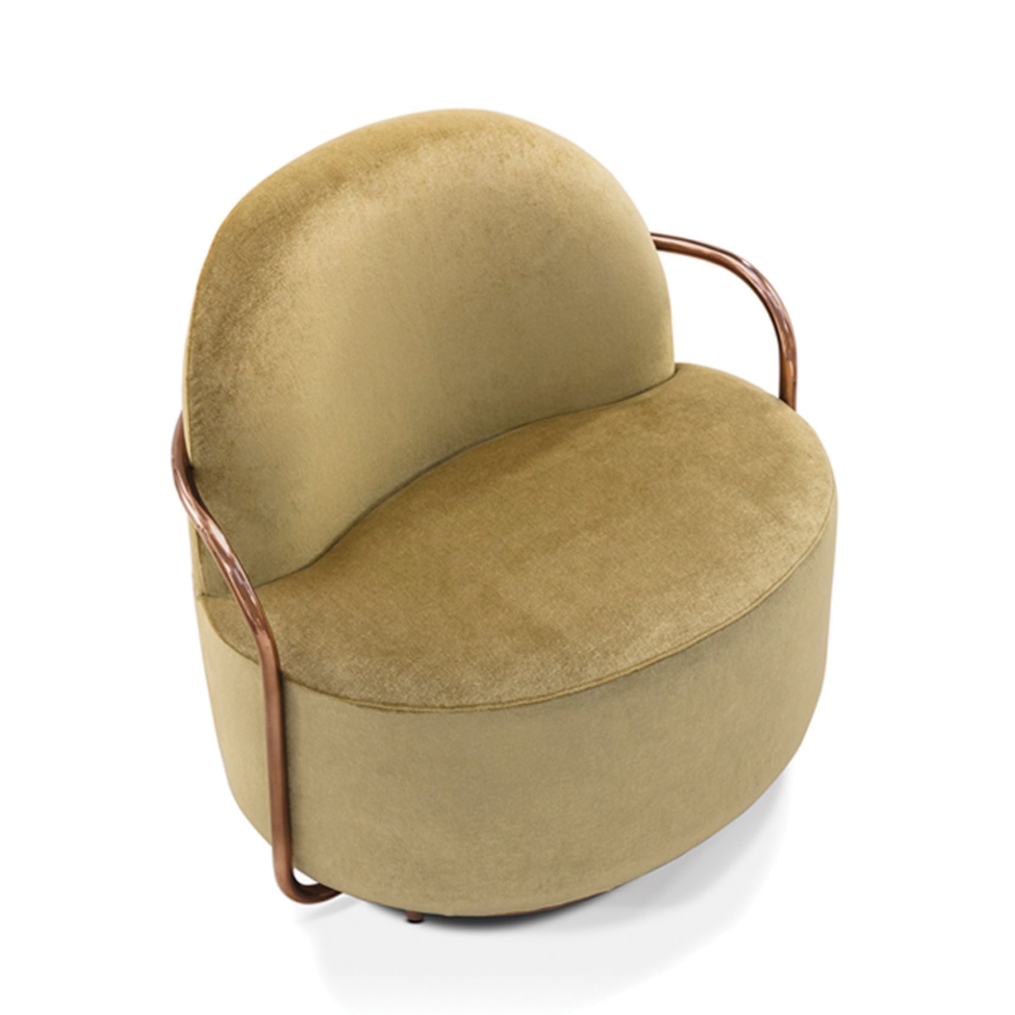 Orion lounge chair from 88 Secrets collection, 94 cm long. Emblem of the contemporary, Orion is a comfortable and welcoming seat, which surprises for its chic and glamorous graphic effect, but also for its unique comfort. It features a luxurious fabric upholstery and an elegant metallic finish that adds a sophisticated touch, enhancing any space. Designed by Nika Zupanc for Scarlet Splendour