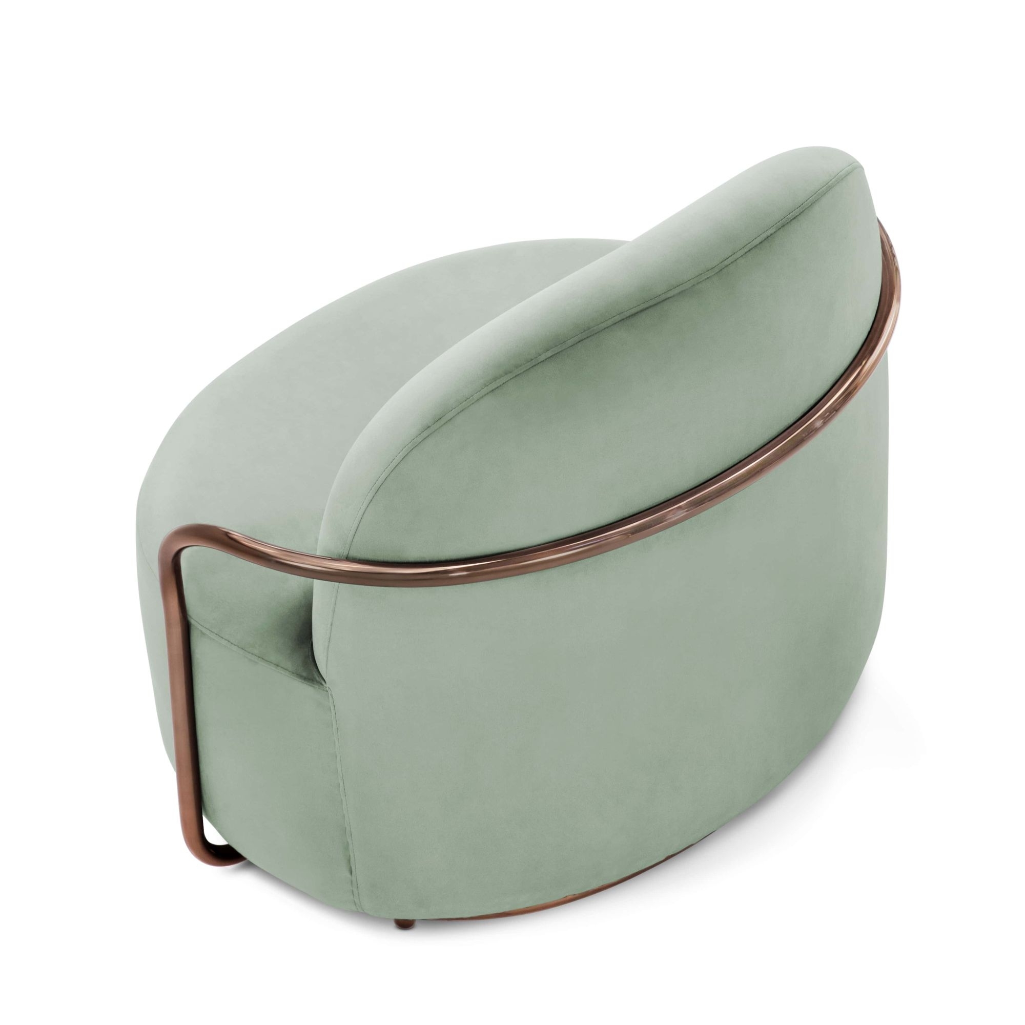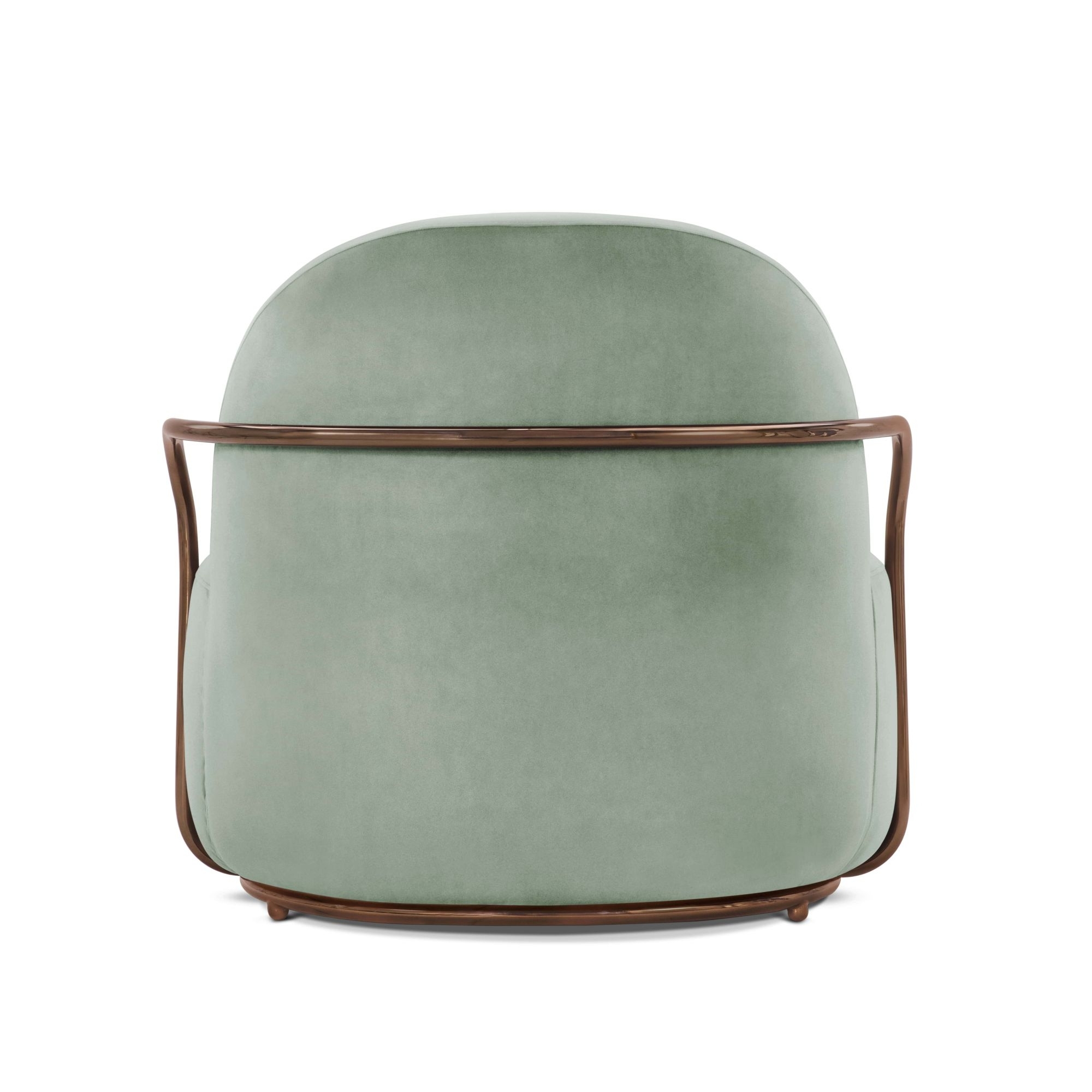 Orion lounge chair from 88 Secrets collection, 94 cm long. Emblem of the contemporary, Orion is a comfortable and welcoming seat, which surprises for its chic and glamorous graphic effect, but also for its unique comfort. It features a luxurious fabric upholstery and an elegant metallic finish that adds a sophisticated touch, enhancing any space. Designed by Nika Zupanc for Scarlet Splendour