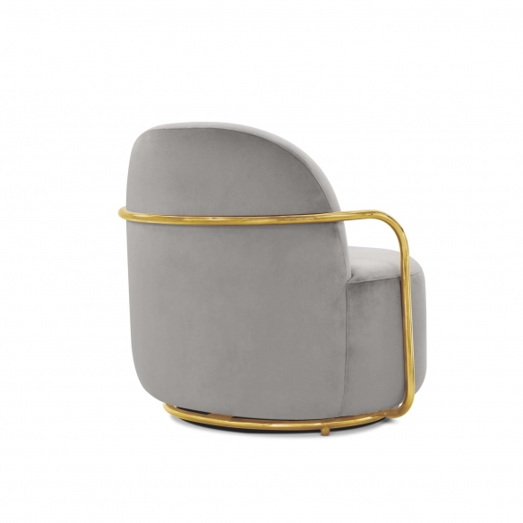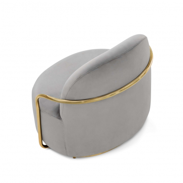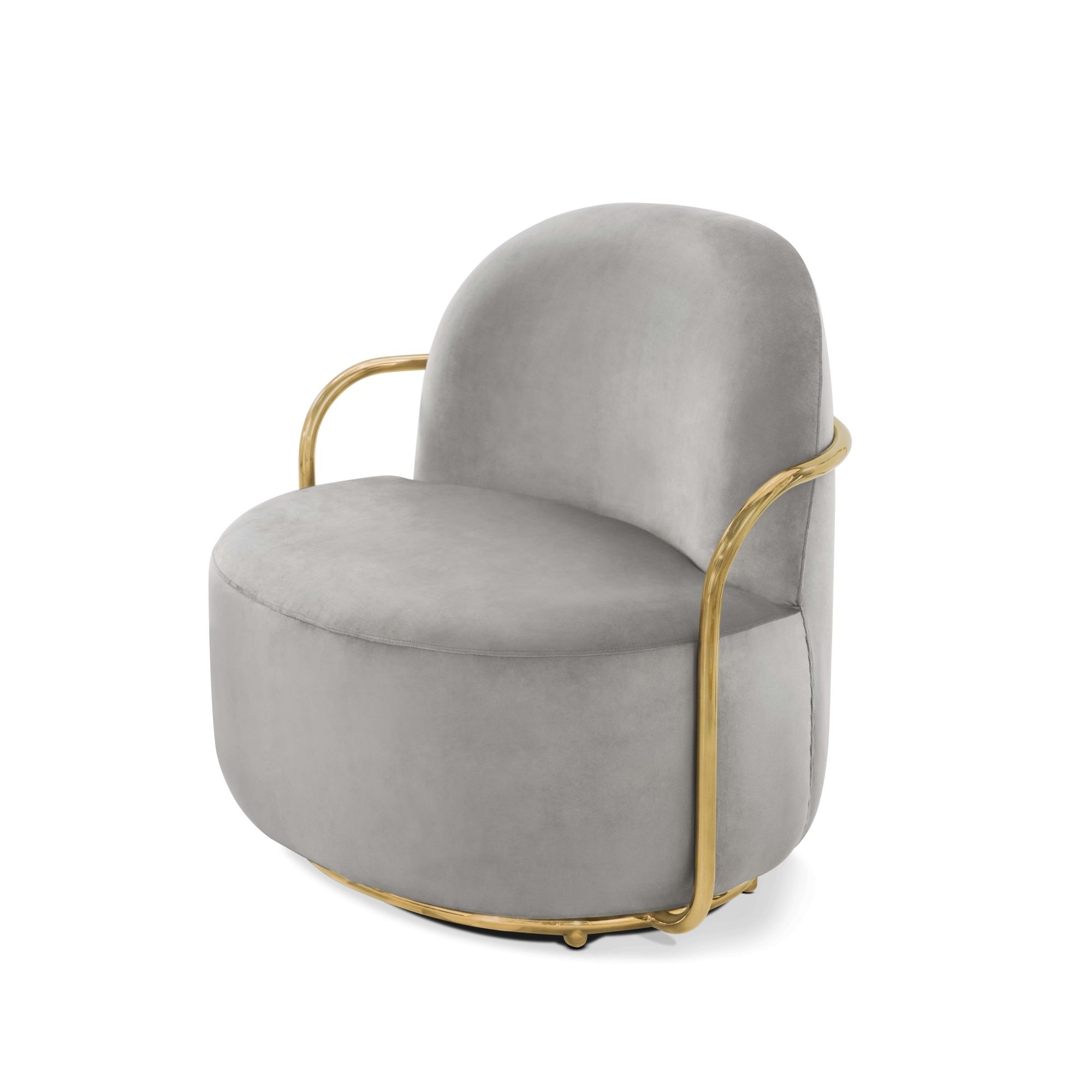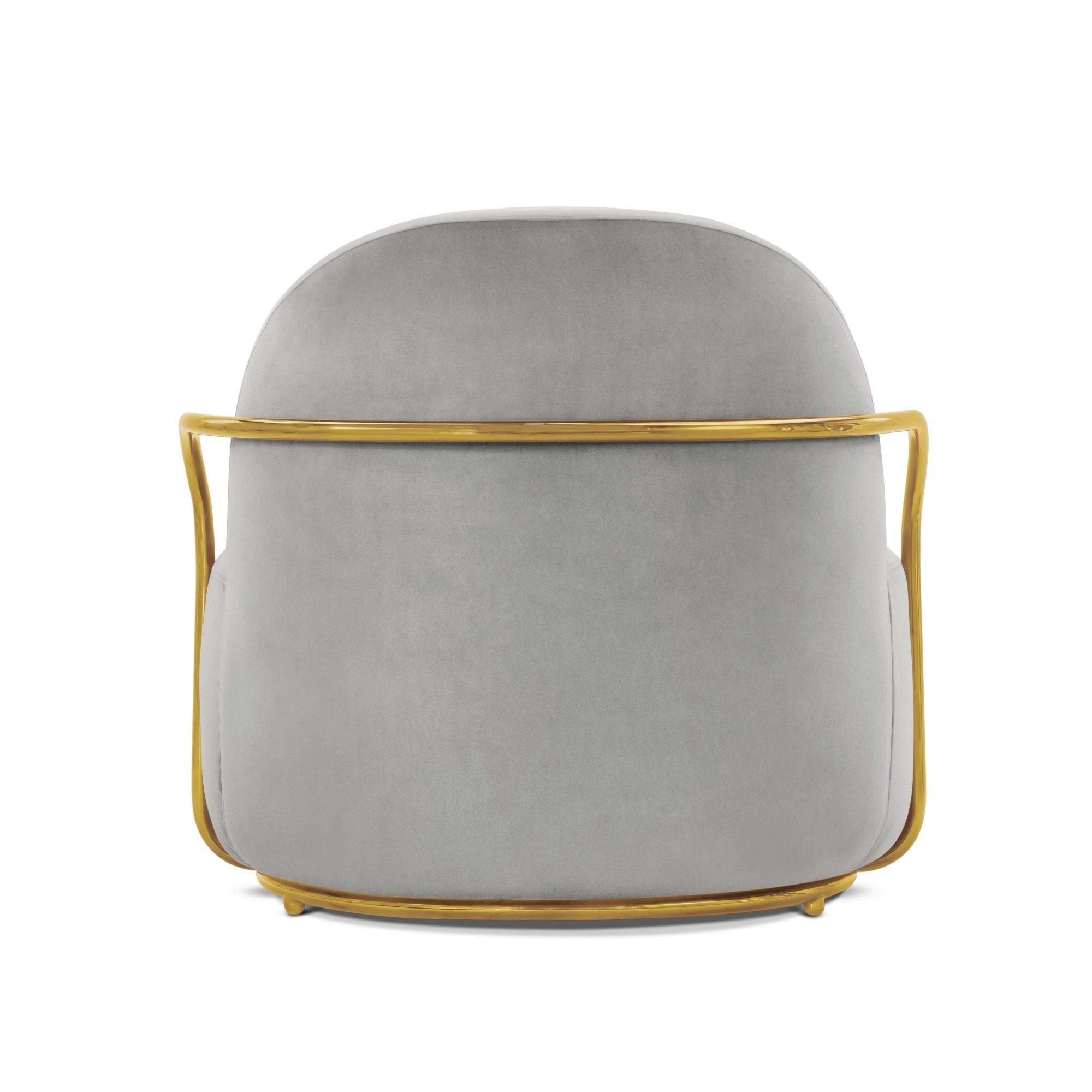 Orion lounge chair from 88 Secrets collection, 94 cm long. Emblem of the contemporary, Orion is a comfortable and welcoming seat, which surprises for its chic and glamorous graphic effect, but also for its unique comfort. It features a luxurious fabric upholstery and an elegant metallic finish that adds a sophisticated touch, enhancing any space. Designed by Nika Zupanc for Scarlet Splendour