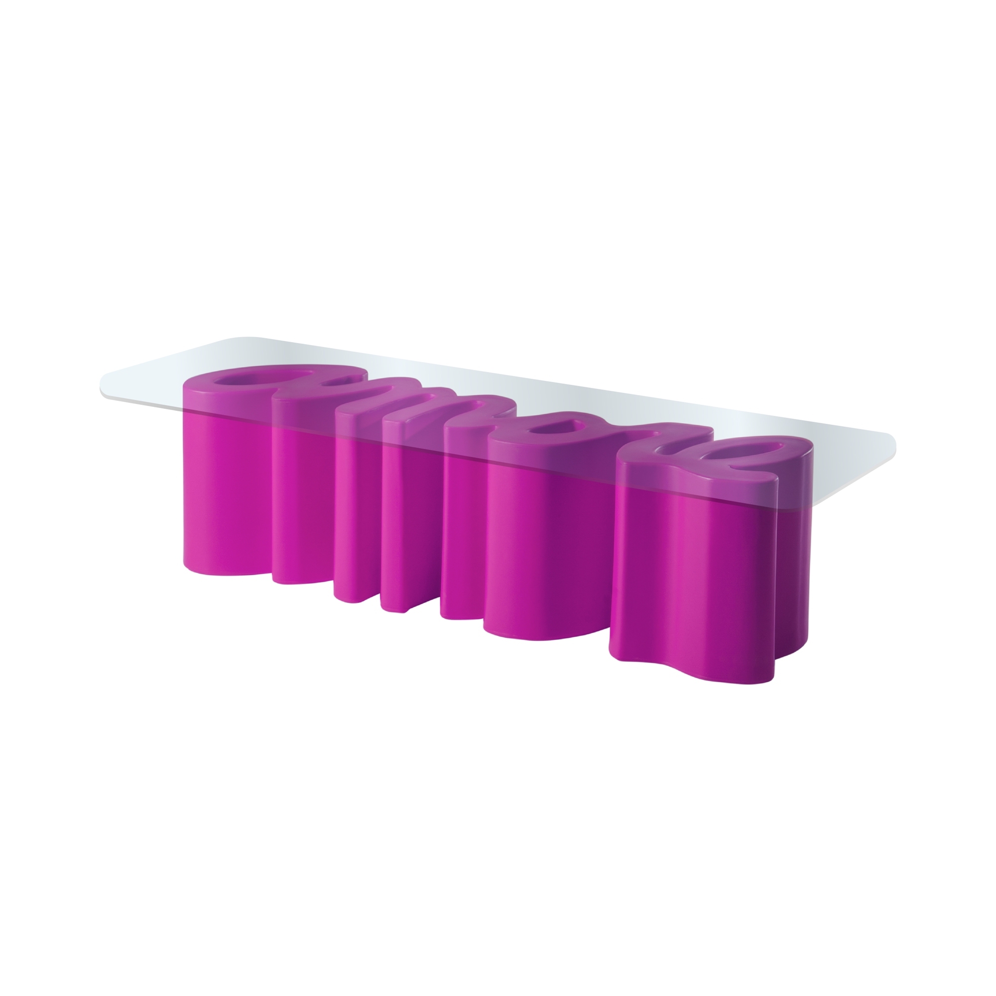 Amore polyethylene coffee table with tempered glass top. Amore is an extravagant and eccentric complement that stands out for its full and exuberant shades, the unpredictable design and the versatility of its materials, fully expressing the creativity of its designer. Infuse a touch of playful light-heartedness into your rooms, choose the whimsy of pop style. Designed by Giò Colonna Romano for Slide.