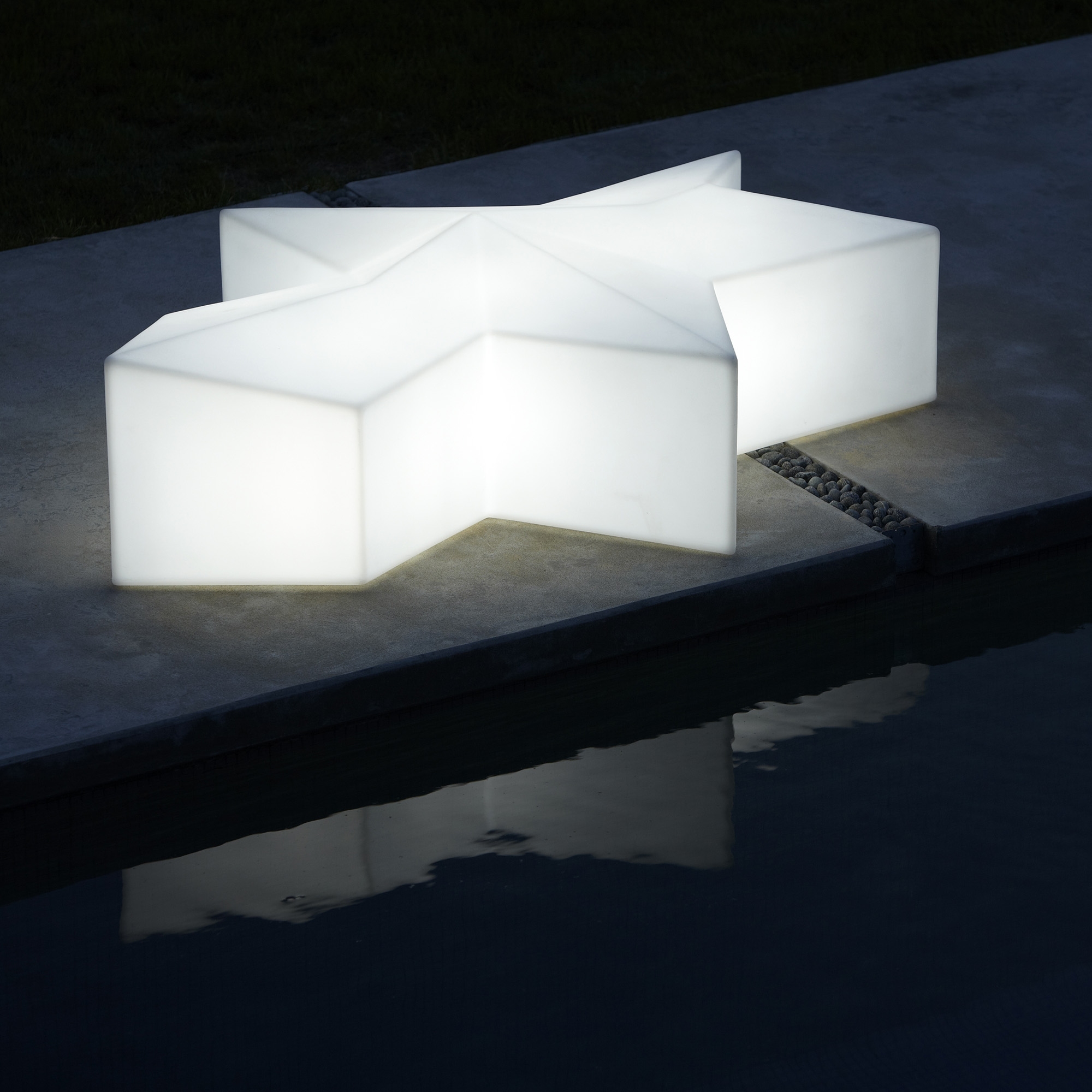Glacè polyethylene luminous bench, 180x125 cm. It's a bench, but it's also a light sculpture that can be imagined as a beautiful star. It lights up in an unusual way, it furnishes in an extraordinary way, it is a unique character. It can be used both indoors and outdoors and will give your environment an unmistakable stunning twist. Designed by Alessandro Mendini for Slide