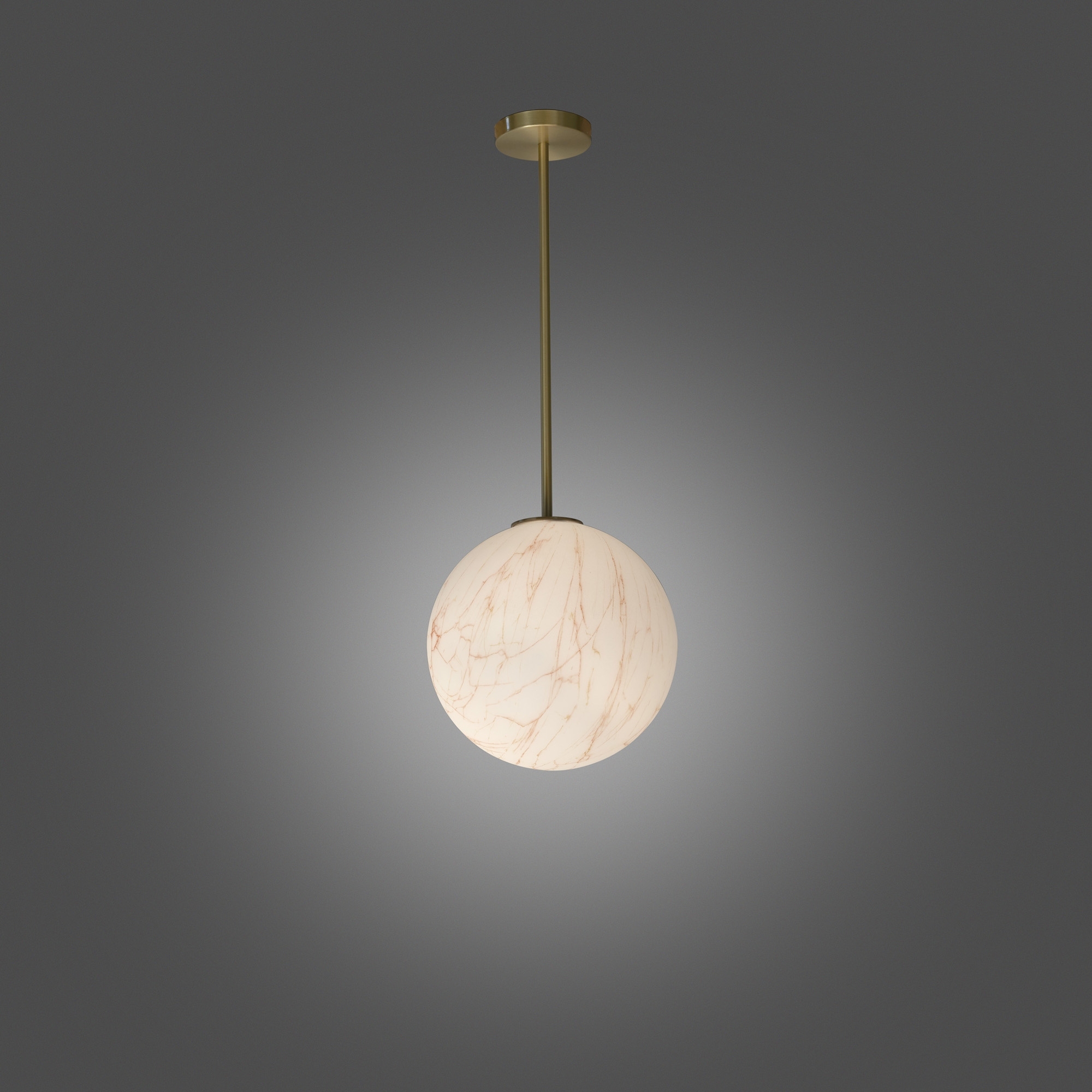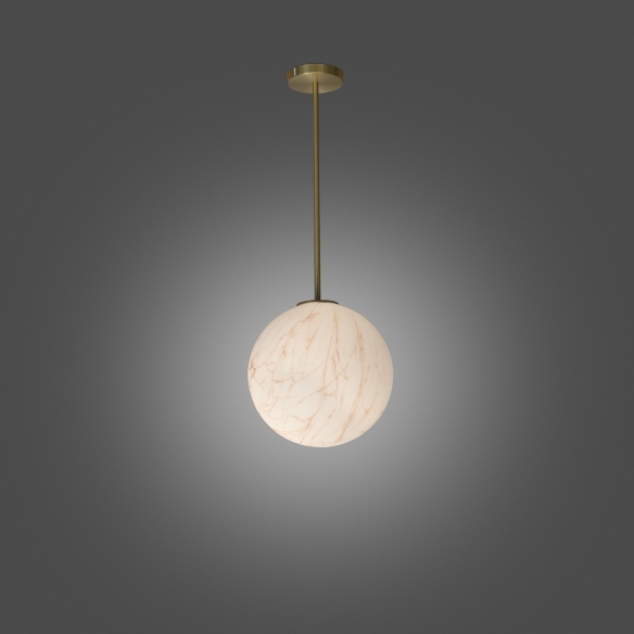 Polyethylene suspension lamp with brass tige from Mineral Tige collection, 30 cm in diameter and 80 cm high. Flawless in its elegance and luxurious to the eye, Mineral Tige is a lamp characterized by a spherical lighting body, adorned with red and gray streaks that create a stunning chromatic contrast with the matte surface that forms the background, recalling the warm tone of brass covering the stem. Gorgeous on its own, this lamp can be combined with other elements to create outstanding settings. Designed by Slide.