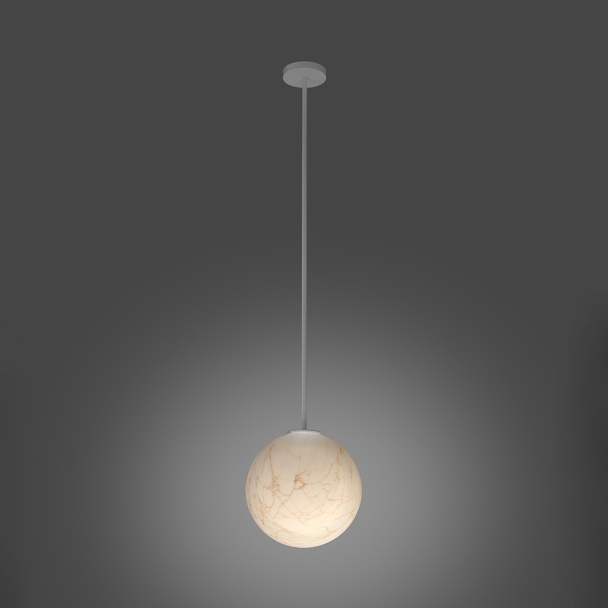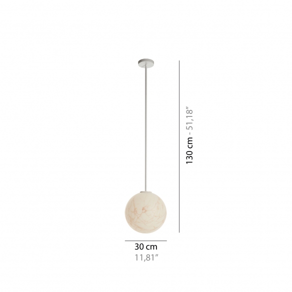 Polyethylene suspension lamp with aluminum tige from Mineral Tige collection, 30 cm in diameter and 130 cm high. Flawless in its elegance and luxurious to the eye, Mineral Tige is a lamp characterized by a spherical lighting body, adorned with red and gray streaks that create a stunning chromatic contrast with the matte surface that forms the background, recalling the cold tone of metal covering the stem. Gorgeous on its own, this lamp can be combined with other elements to create outstanding settings. Designed by Slide.