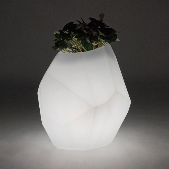 Secret polyethylene light vase, 52 cm high. Like a precious stone, the Secret vase stands out from the rest for its irregular graphic design, with embossed shapes that create a pleasantly interesting optical effect when the light passes through them. Stunning on its own but gorgeous with green plants or fresh flowers, this vase is also a lamp that casts a soft light to decorate your environments in an unusual way. Designed by Rosaria Rattin for Slide.