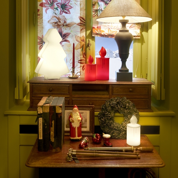 Polyethylene table lamp from Fiamma/Fiammetta collection, 30 cm high. With its gorgeous colours, this lamp is the perfect addition to your Christmas decor. Stunning on a side table or fireplace, this lamp will create a warm and welcoming space, embodying the essence of its name. Designed by Alberto Ghirardello for Slide.
