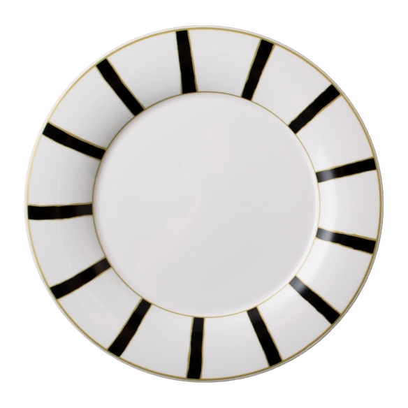 Plate from Striche Nere e Oro collection, 31 cm in diameter. Superb for showcasing delicious culinary creations, this fine porcelain plate features a black striped pattern. Its stunning aesthetic makes it perfect for any occasion, from a romantic dinner to a formal lunch, bringing a vintage vibe to leave your diners breathless. Designed and manufactured by Geminiano Cozzi Venice 1765.