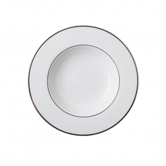 Bone china porcelain soup plate from Ducale collection, 24.5 cm. Flawless in its finesse and stunning in its pure white porcelain, this plate is perfect for an elegant table. Crafted with beautiful details, it features platinum details that outlines its edge. Designed by Geminiano Cozzi Venice 1765.