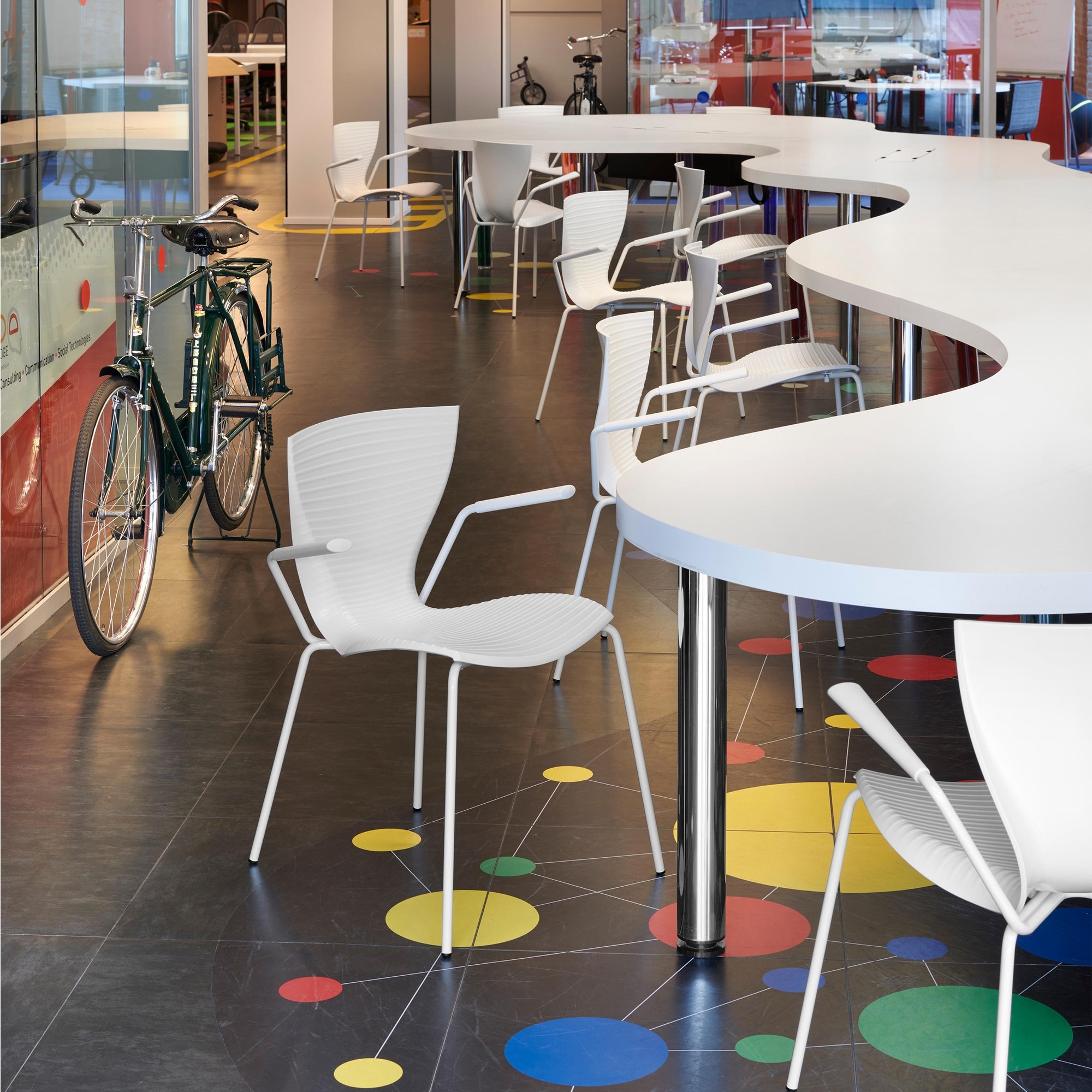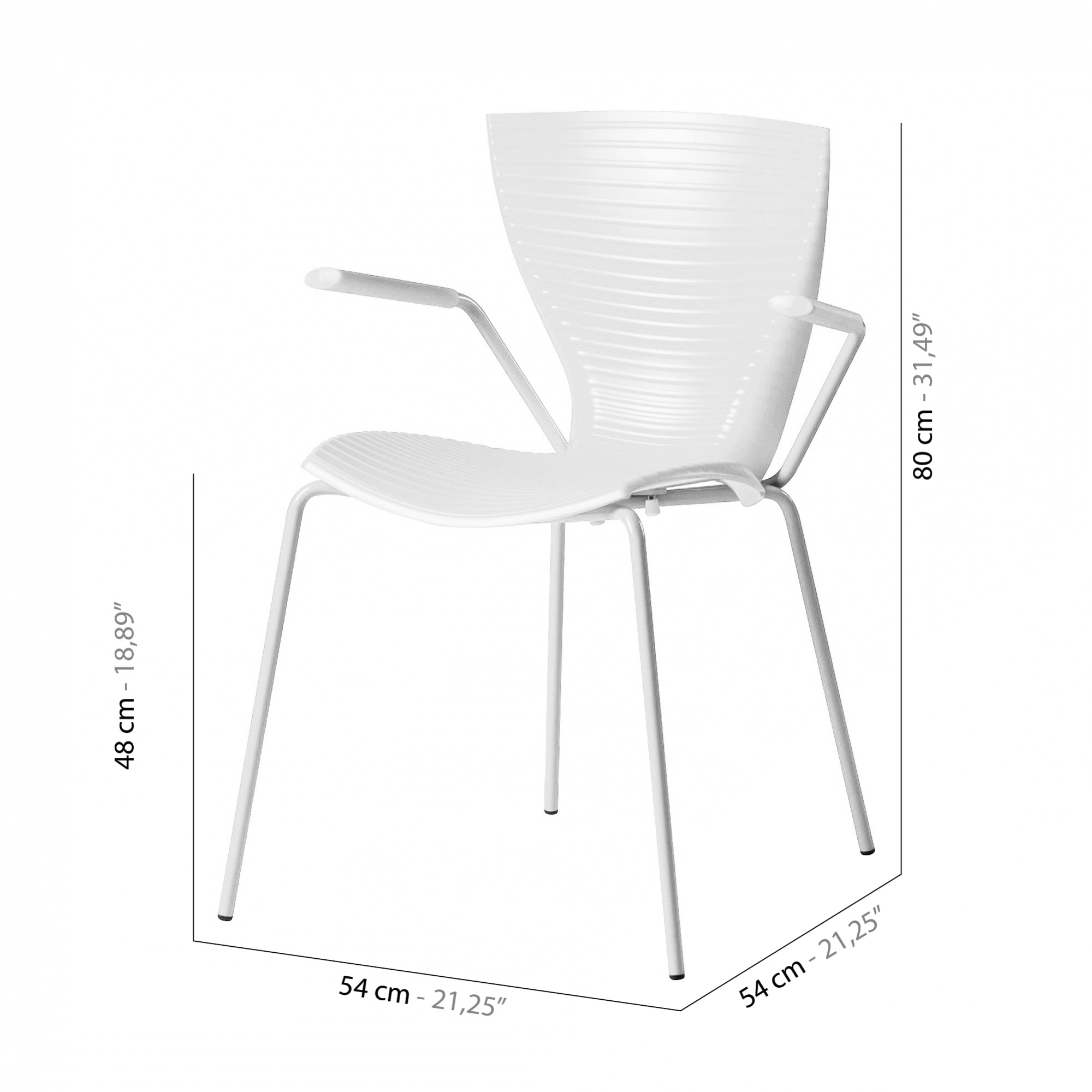Gloria Meeting polypropylene chair with armrests, 54 cm long and 80 cm high. Visually appealing, Gloria Meeting is a modern chair which looks to the future in its conceptuality. Curved backrest and comfortable seat, with a texture-looking surface and powder-coated metal tubular legs, this chair favors its sinuous lines and ergonomic design. Designed by Marc Sadler for Slide.