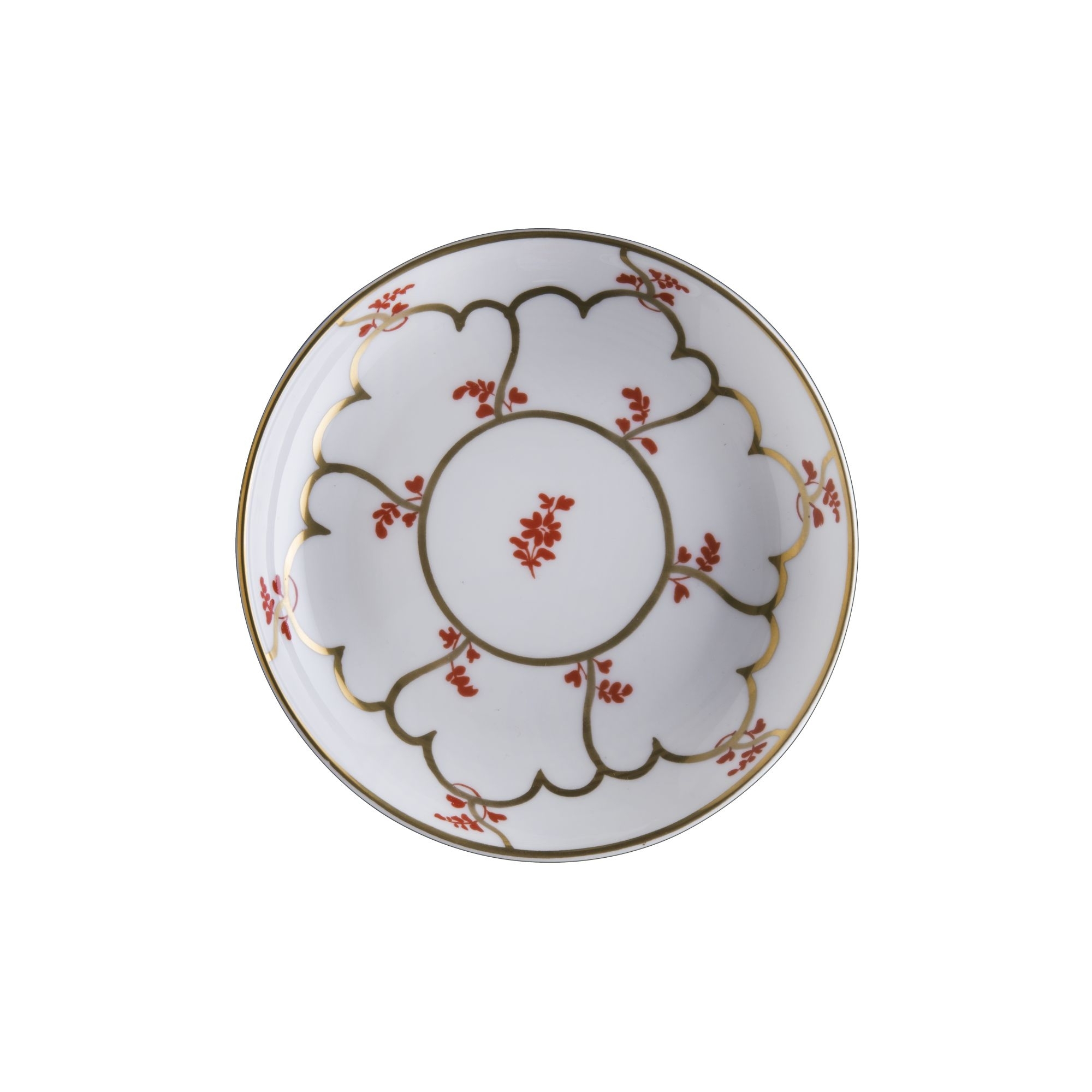 Porcelain butter and bread plate from Feston and Cadena Rosso line, 15 cm. With timeless elegance, this B&B plate is perfect on special events. Its sparkling red details, along with golden chains and festoons, bring class and finesse to your table. Its unique design, as well as its stunning porcelain, makes it perfect for your favorite food. Its beautiful shades will catch the eye and leave your guests breathless. Made by Geminiano Cozzi.