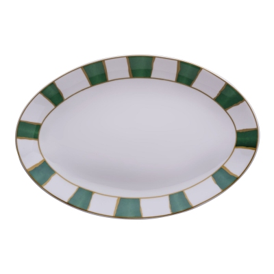 Platter from Striche Verdi e Oro line, 45 cm long. Outstandingly elegant and beautifully crafted with stunning details, this porcelain platter is a timeless accessory. Perfect for formal occasions or special events, pure white sets the scene for a gorgeous green and gold striped pattern. Designed and manufactured by Geminiano Cozzi Venice 1765.