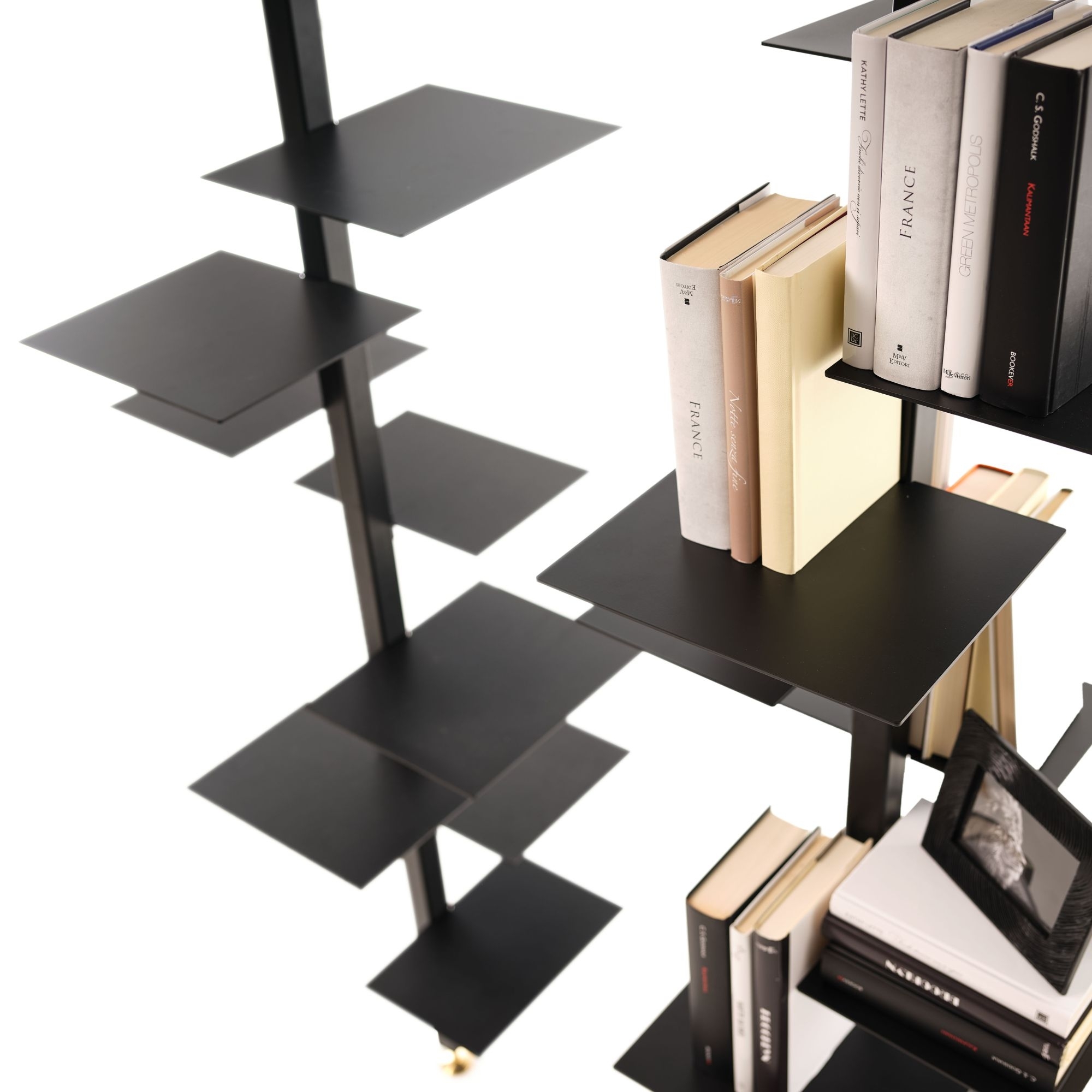 Adelaide Metal black varnished metal bookcase, 55 cm long. Simple and beautiful, with an elegant and airy design that embraces a modern aesthetic, Adelaide is a bookcase developed along a vertical axis with wide shelves, which differ in size, creating a pleasant visual dynamism. A place for everything and everything in its place: this beautiful furnishing accessory provides you with all the space you need! Designed by Claudio Bitetti for Mogg.