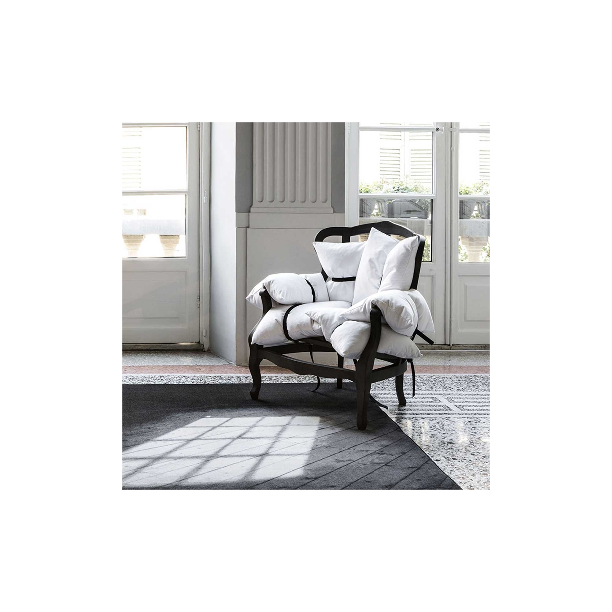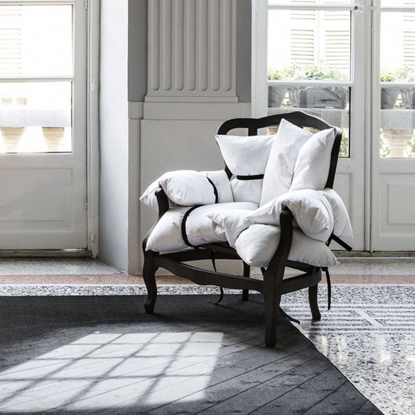 7Pillows solid beech wood armchair with removable feather cushions, 100 cm long and 100 cm high. Unusual and undeniably contemporary, 7Pillows is an armchair that embraces aesthetics and function. As its name suggests, this armchair is made up of 7 different cushions, held together by black straps in an untidy way, almost as if they were there by chance. Available in different colors and fabrics, 7Pillows will become the focal point of your rooms and will certainly not go unnoticed! Designed by Marcantonio Raimondi Malerba for Mogg.