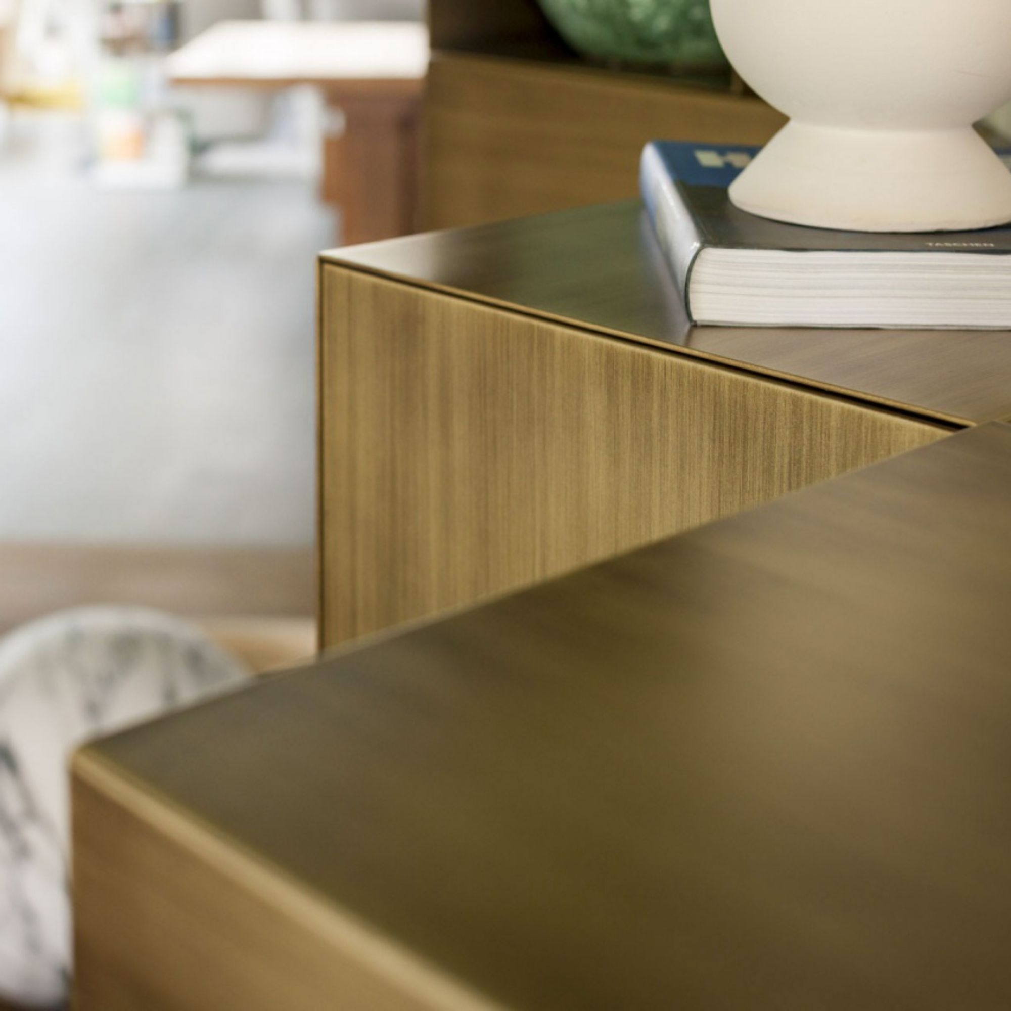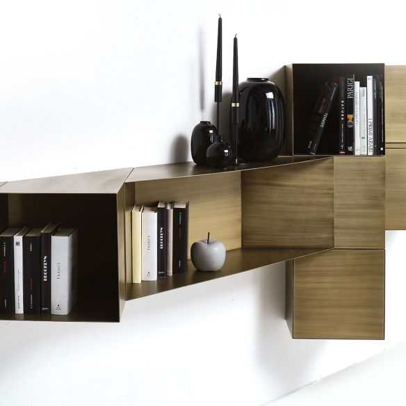 Cellula painted metal wall unit - composition 3 (made up of seven modules) - 198 cm long and 140 cm high. Modern and linear, Cellula is a versatile and functional furnishing solution, available in two different finishes: patinated bronze and burnished. The modular structure allows you to arrange it according to your needs, turning it 180° and fixing it to the left or right. The magnetic door kit can be purchased separately to add finesse to a beautiful design. Designed by StudioPang for Mogg.