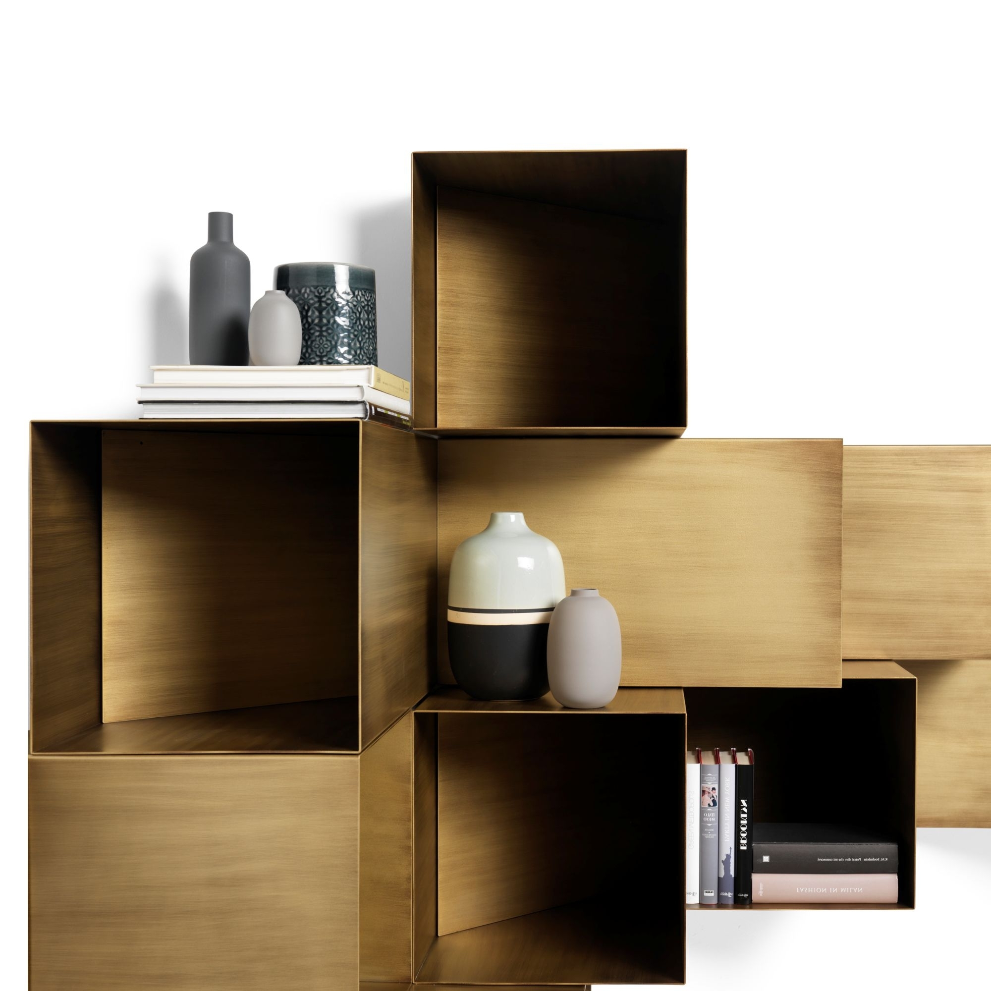 Cellula painted metal wall unit - composition 7 (made up of nine modules) - 403 cm long and 105 cm high. Modern and linear, Cellula is a versatile and functional furnishing solution, available in two different finishes: patinated bronze and burnished. The modular structure allows you to arrange it according to your needs, turning it 180° and fixing it to the left or right. The magnetic door kit can be purchased separately to add finesse to a beautiful design. Designed by StudioPang for Mogg.