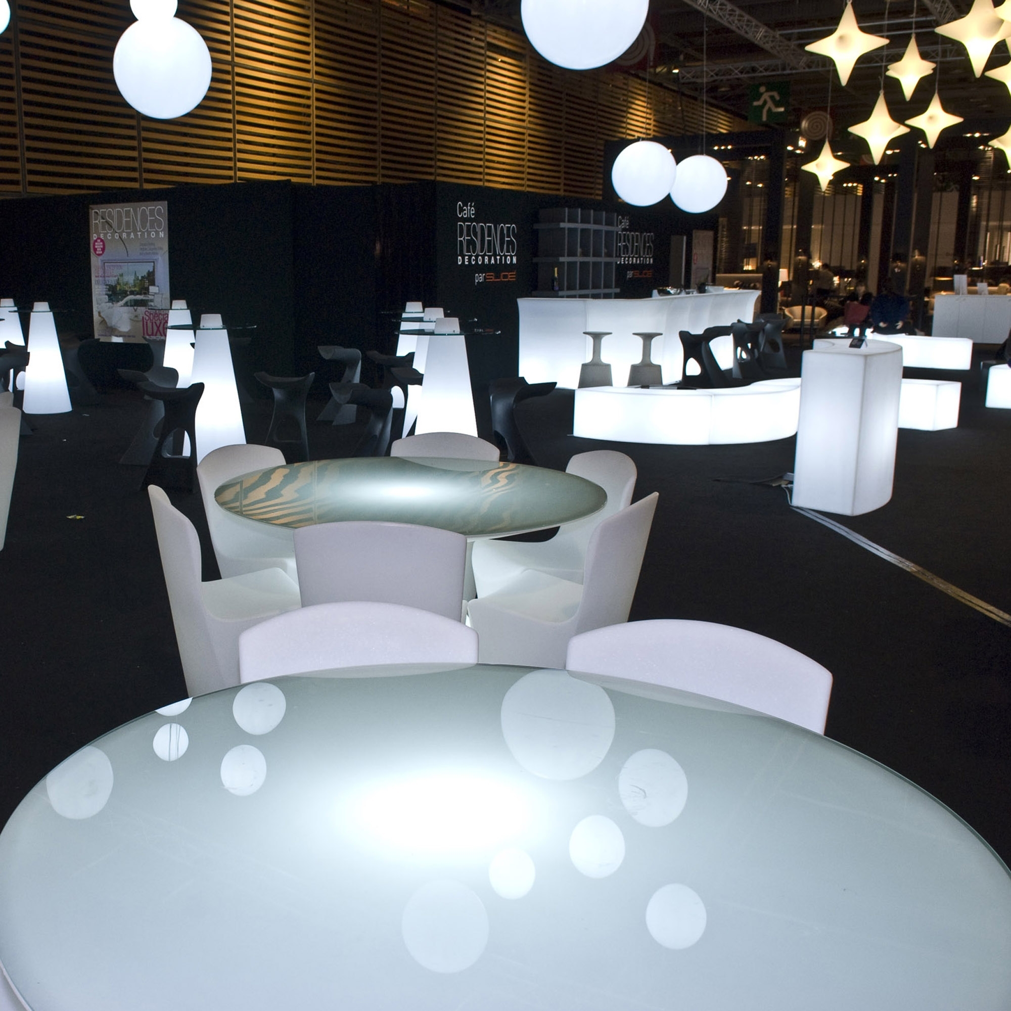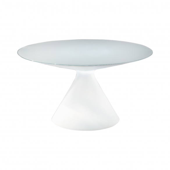 ED light table with polyethylene base and glass top, 140 cm in diameter and 72 cm high. A combination of classic and contemporary design, the ED table features perfect geometric shapes. It features a light-up base to add further visual interest, making it ideal for surprising guests or simply enjoying the ambiance and adding perfect lighting to your living area or outdoor space. Designed by Guglielmo Berchicci for Slide.