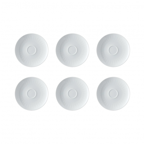 6 porcelain espresso cup saucers from Joyn line, 16 cm. Available in Mint Green, Grey, Denim Blue and White, the saucers feature fine detailing on a quality porcelain background. Gorgeous when paired with espresso cups from the same collection, these saucers keep surfaces clean so you can make coffee break even more pleasurable. Designed and manufactured by Rosenthal.