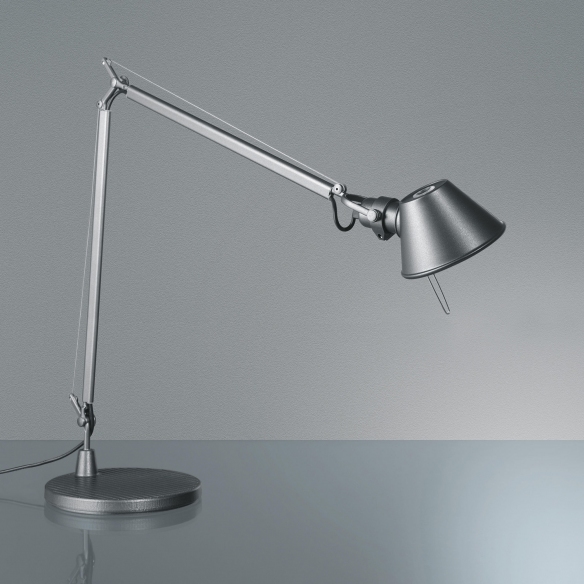 Tolomeo Pure Integralis table lamp with anodized aluminum diffuser, adjustable arms and base in polished aluminium, joints and supports in polished aluminum with spring balancing system, high efficiency and low energy saving LED technology and PURE INTEGRALIS® system with function of sanitizing surfaces that illuminates, making pathogenic microorganisms harmless. Light source: LED 1x7W - 3600K - 483lm - CRI 80. The lamp is dimmable via dimmer microswitch. Designed by Michele De Lucchi and Giancarlo Fassina for Artemide.