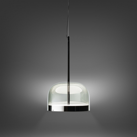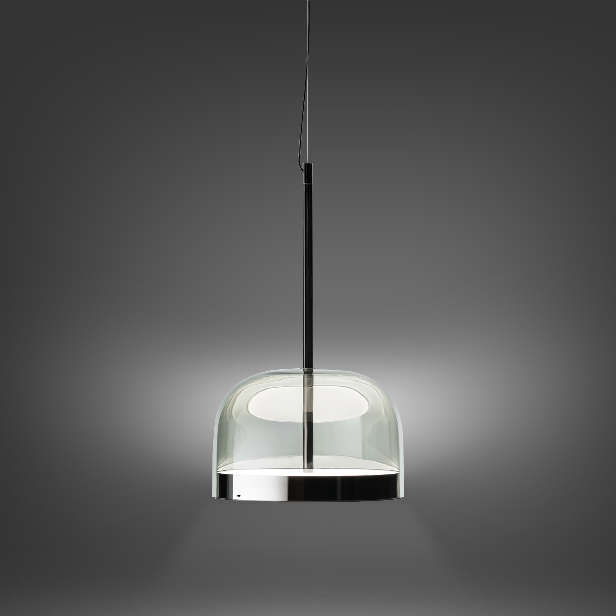 Medium Equatore suspension lamp with dimmable diffused light with transparent glass diffuser, galvanized metal frame, steel suspension wire, painted metal canopy and two polycarbonate discs. Available in Copper and Black, the Equatore suspension lamp looks stunning in modern settings. 40W 2700K - CRI>90 - 2790lm LEDs. Designed by Gabriele and Oscar Buratti for Fontana Arte.