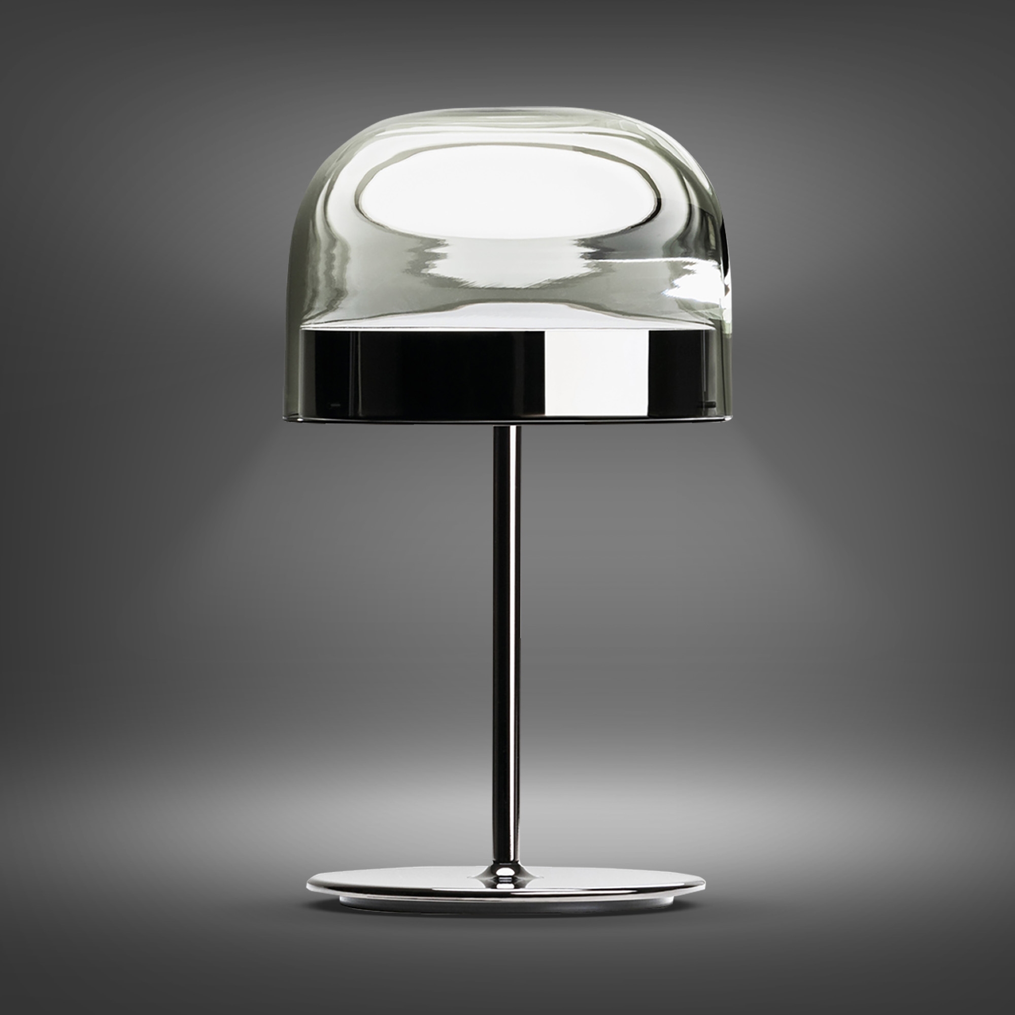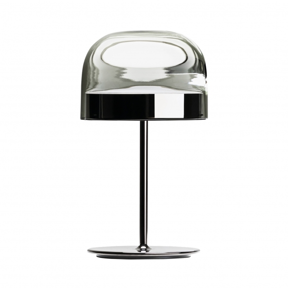 Medium Equatore table lamp with dimmable diffused light with transparent glass diffuser, two polycarbonate discs and painted metal frame. Available in Copper and Black, the Equatore table lamp looks stunning in modern settings. 40W 2700K - CRI>90 - 4500lm LEDs. Plug-in power supply with interchangeable plugs (uk - usa - europe - australia). Designed by Gabriele and Oscar Buratti for Fontana Arte.