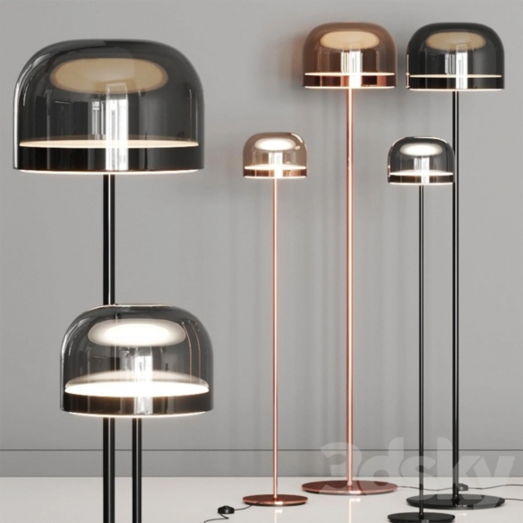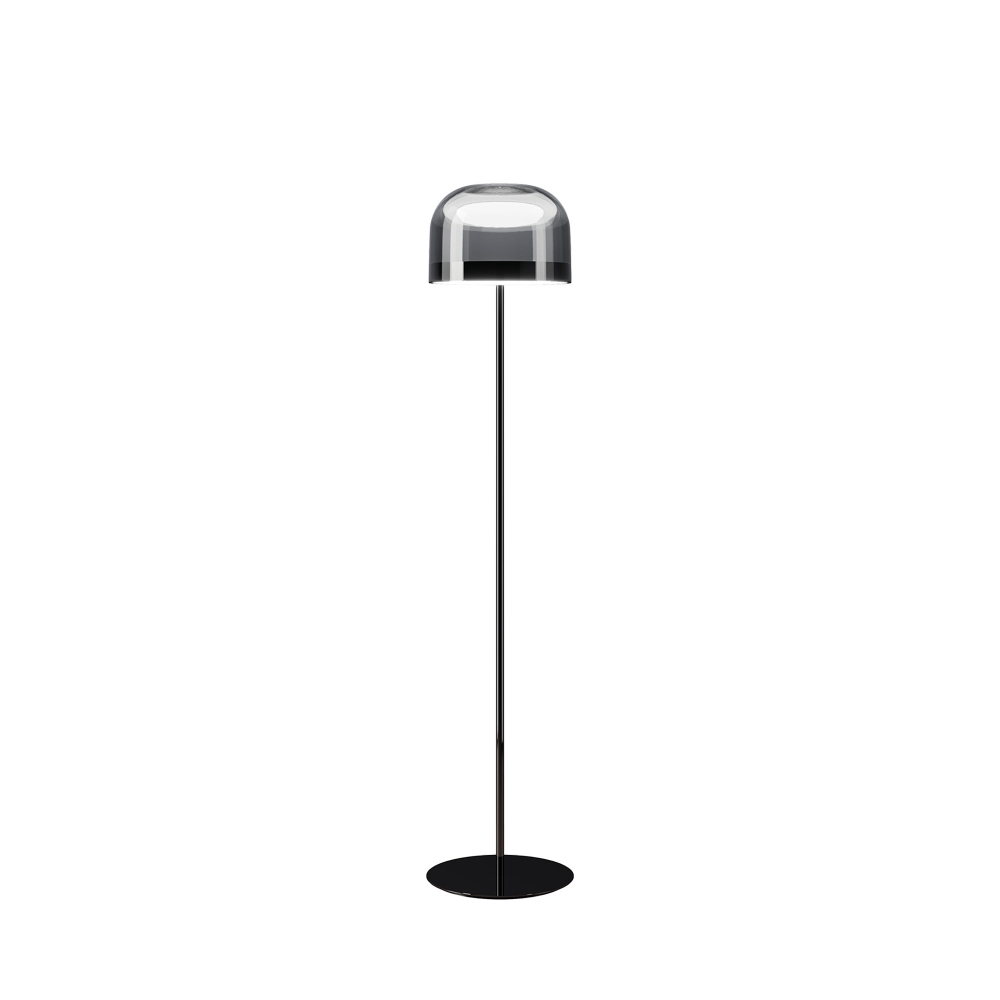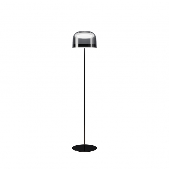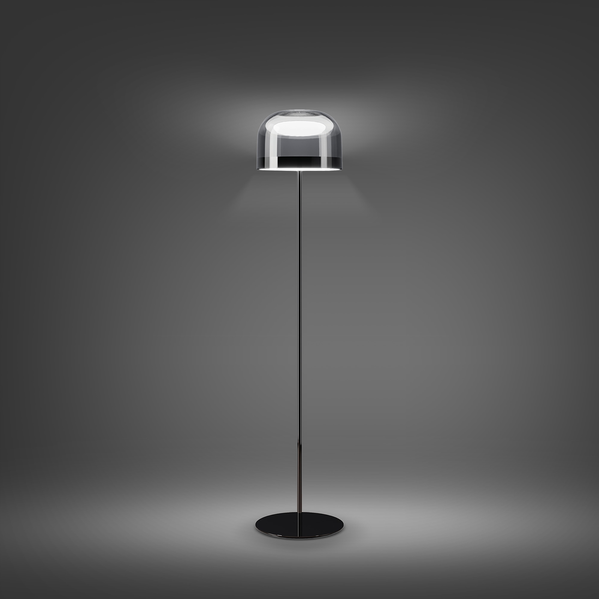 Small Equatore floor lamp with dimmable diffused light with transparent glass diffuser, two overlapping polycarbonate discs, galvanized metal frame. Available in Chrome, Gold, Copper and Black, the Equatore floor lamp looks stunning in modern settings. 25W 2700K - CRI>90 - 2900lm LEDs. Plug-in power supply with interchangeable plugs (uk - usa - europe - australia). Designed by Gabriele and Oscar Buratti for Fontana Arte.