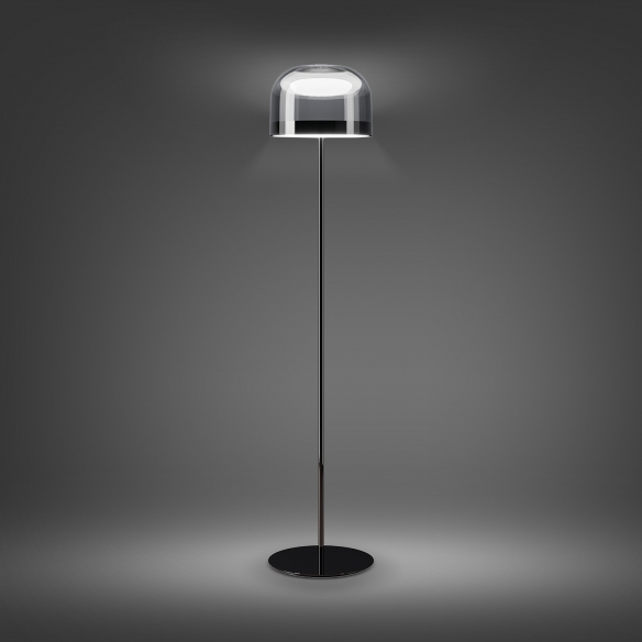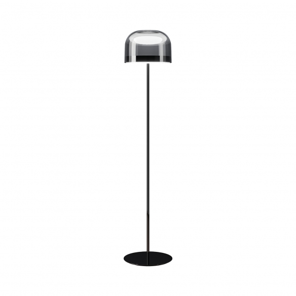 Medium Equatore floor lamp with dimmable diffused light with transparent glass diffuser, two overlapping polycarbonate discs, galvanized metal frame. Available in Chrome, Gold, Copper and Black, the Equatore floor lamp looks stunning in modern settings. 40W 2700K - CRI>90 - 4500lm LEDs. Plug-in power supply with interchangeable plugs (uk - usa - europe - australia). Designed by Gabriele and Oscar Buratti for Fontana Arte.