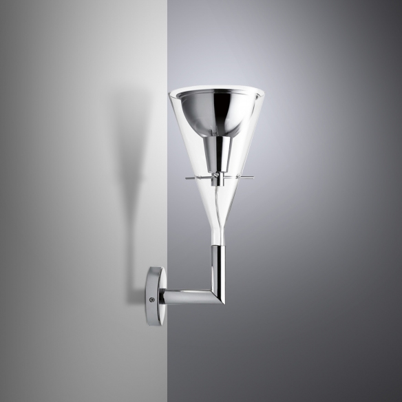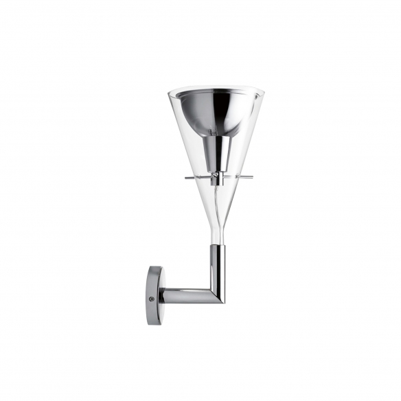 Flûte wall lamp with transparent borosilicate glass diffuser, reflector in polished chromed aluminum, reflector support and frame in chromed metal. Perfect in the living room or hallway, the lamp is dimmable. 1x205W E27 (not included). Designed by Franco Raggi for Fontana Arte.