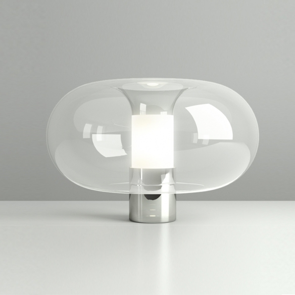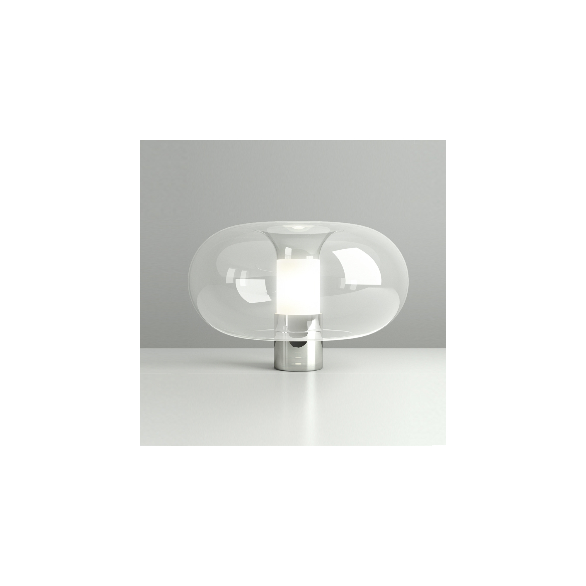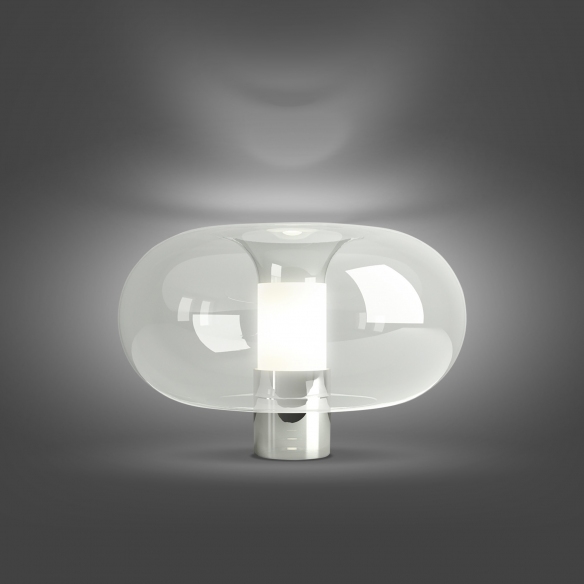 Fontanella large table lamp with diffused dimmable light in borosilicate blown glass, galvanized metal frame, transparent cable, dimmer and two-pole European plug. Available in Black, Chrome and Brass, the Fontanella table lamp is stunning in the living room or office, illuminating your spaces with a gorgeous light. 1x77W E27 (not included). Designed by Federico Peri for Fontana Arte.