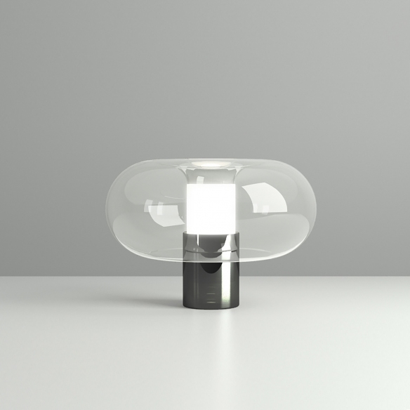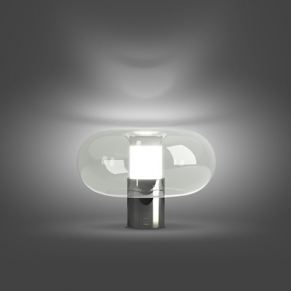 Fontanella medium table lamp with diffused dimmable light in borosilicate blown glass, galvanized metal frame, transparent cable, dimmer and two-pole European plug. Available in Black, Chrome and Brass, the Fontanella table lamp is stunning in the living room or office, illuminating your spaces with a gorgeous light. 1x28W E14 (not included). Designed by Federico Peri for Fontana Arte.
