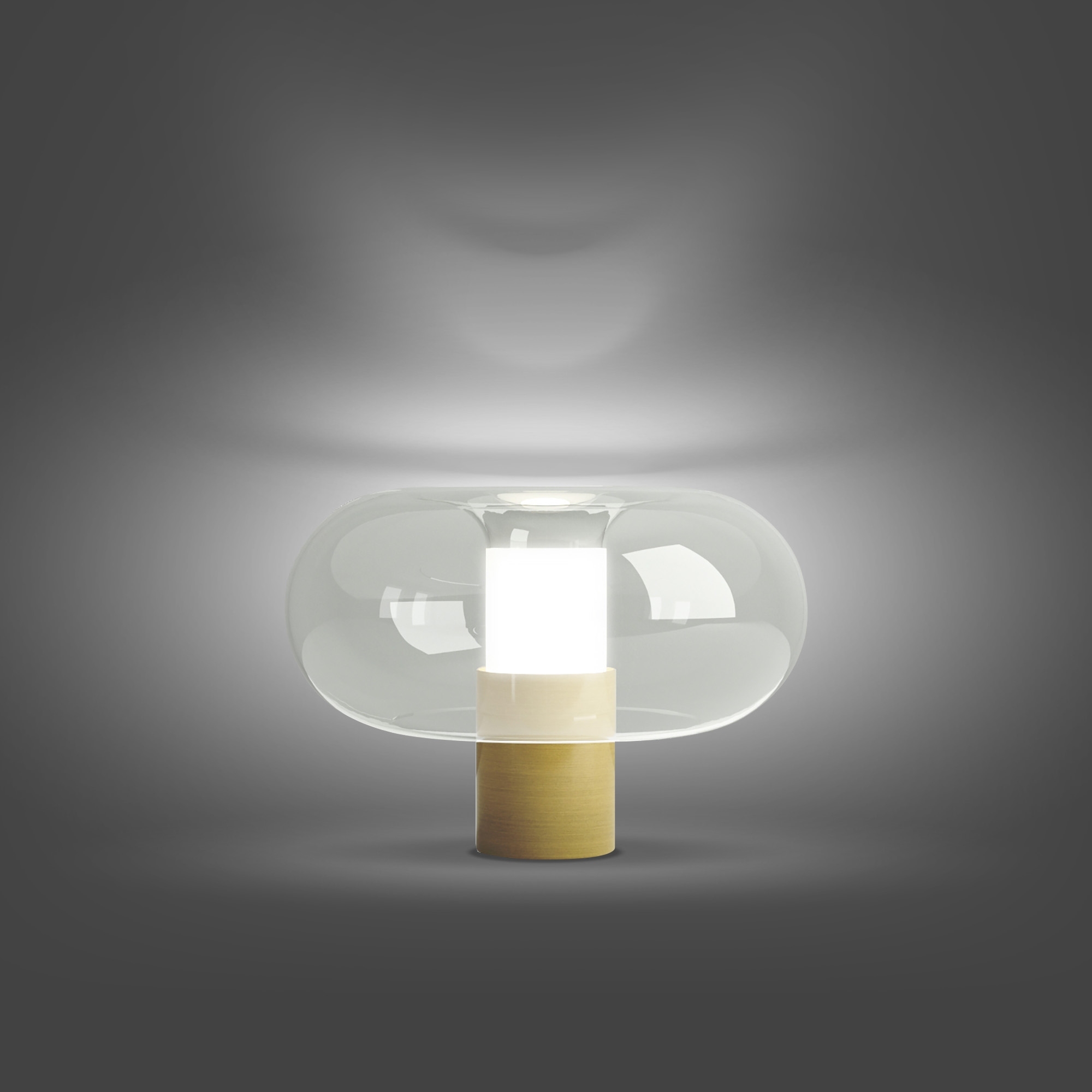 Fontanella medium table lamp with diffused dimmable light in borosilicate blown glass, galvanized metal frame, transparent cable, dimmer and two-pole European plug. Available in Black, Chrome and Brass, the Fontanella table lamp is stunning in the living room or office, illuminating your spaces with a gorgeous light. 1x28W E14 (not included). Designed by Federico Peri for Fontana Arte.