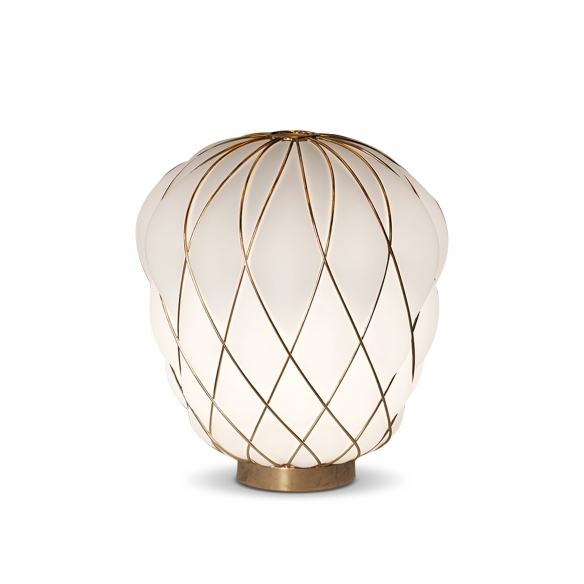 Medium Pinecone table lamp with acid-etched blown glass diffuser, galvanized metal grid and base, power cord, dimmer and transparent two-pole European plug. Like a gorgeous pine cone, the Pinecone table lamp casts a pleasant diffused light in the room. Perfect on a console table, the lamp is dimmable. 1x116W E27 light source (not included). Designed by Paola Navone for Fontana Arte.