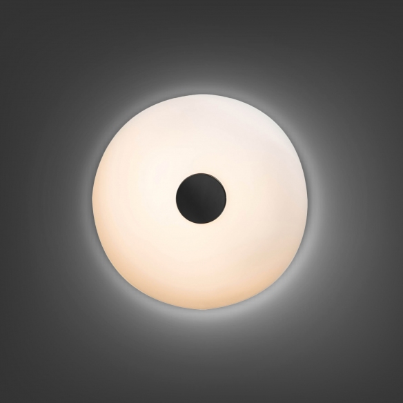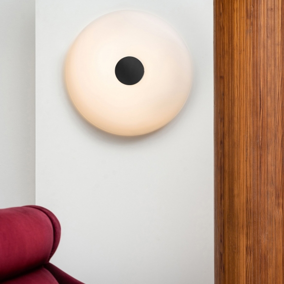 Dimmable large Tropico wall lamp made of acid-etched opaline blown glass and central button in galvanized metal. Modern and evocative, the Tropico wall lamp softly illuminates rooms with a pleasant diffused light. 42.5W - 3000K - CRI>80 - 4600lm LEDs. Designed by Gabriele and Oscar Buratti for Fontana Arte.
