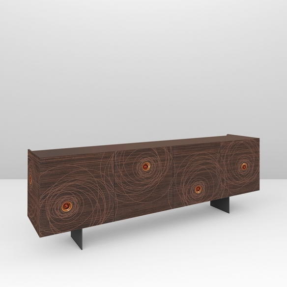 Sideboard with four doors from the G-Round line made of lacquered wood with metal base with graphite gray finish, MDF doors and digitally printed graphics with protective water-based varnish. Perfect for furnishing a modern and carefree living area, the sideboard is equipped with practical shelves and perfect as a low piece on which to display decorative vases or various objects. Designed by Massimo Ballardin for Pictoom.