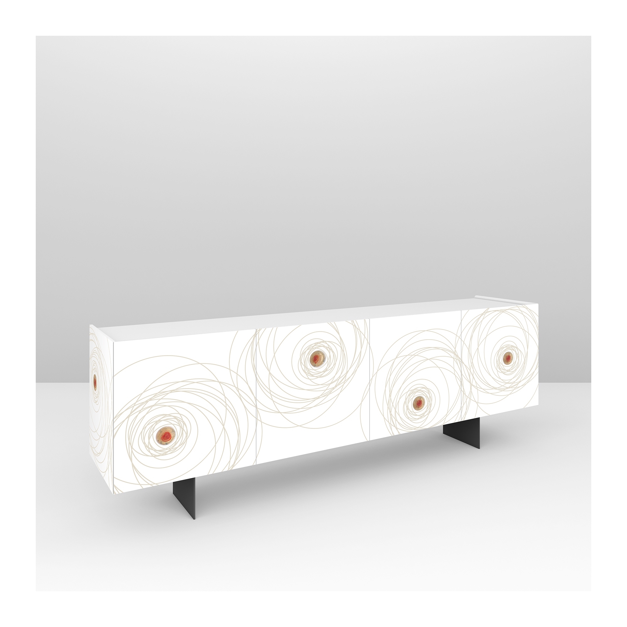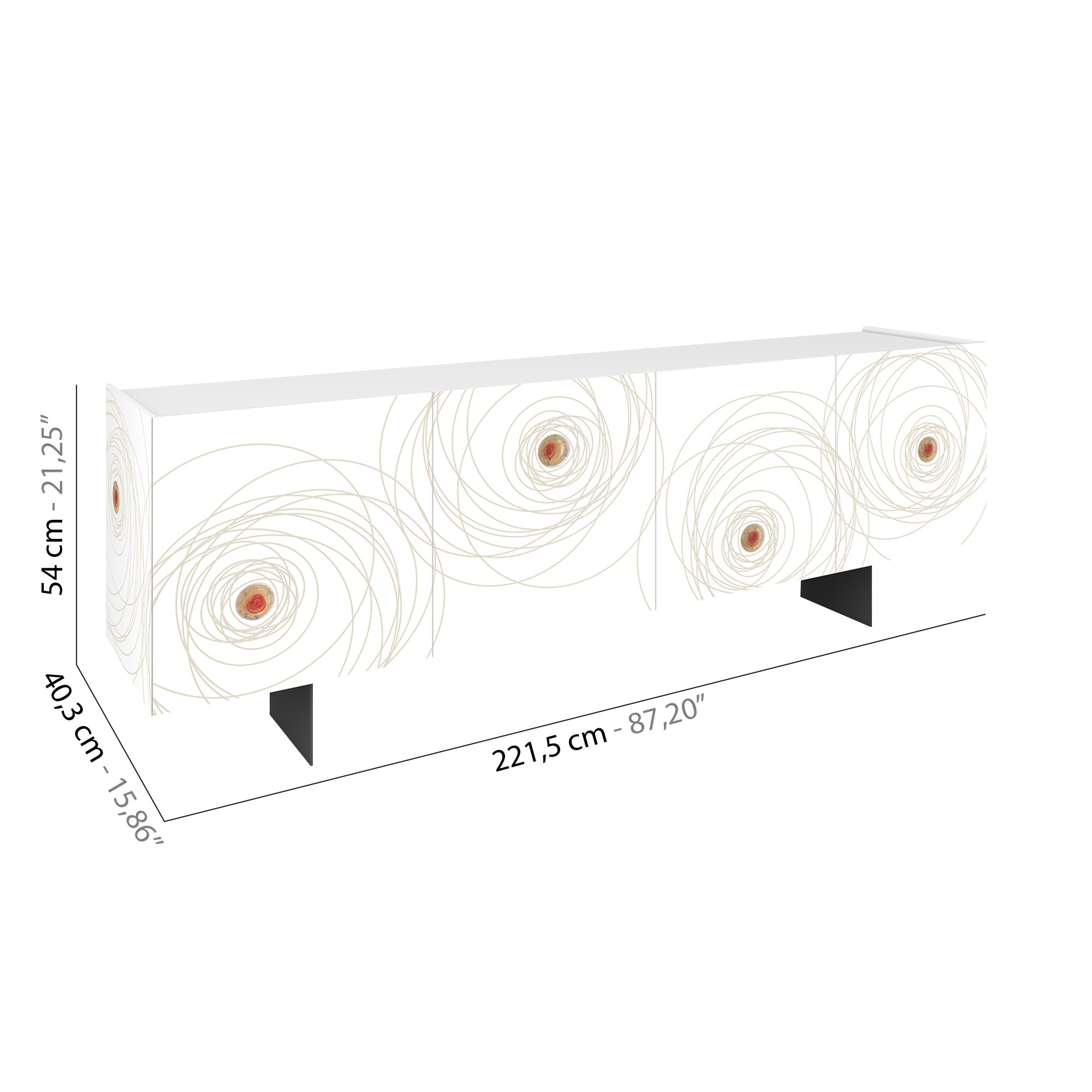 Sideboard with four doors from the G-Round line made of lacquered wood with metal base with graphite gray finish, MDF doors and digitally printed graphics with protective water-based varnish. Perfect for furnishing a modern and carefree living area, the sideboard is equipped with practical shelves and perfect as a low piece on which to display decorative vases or various objects. Designed by Massimo Ballardin for Pictoom.