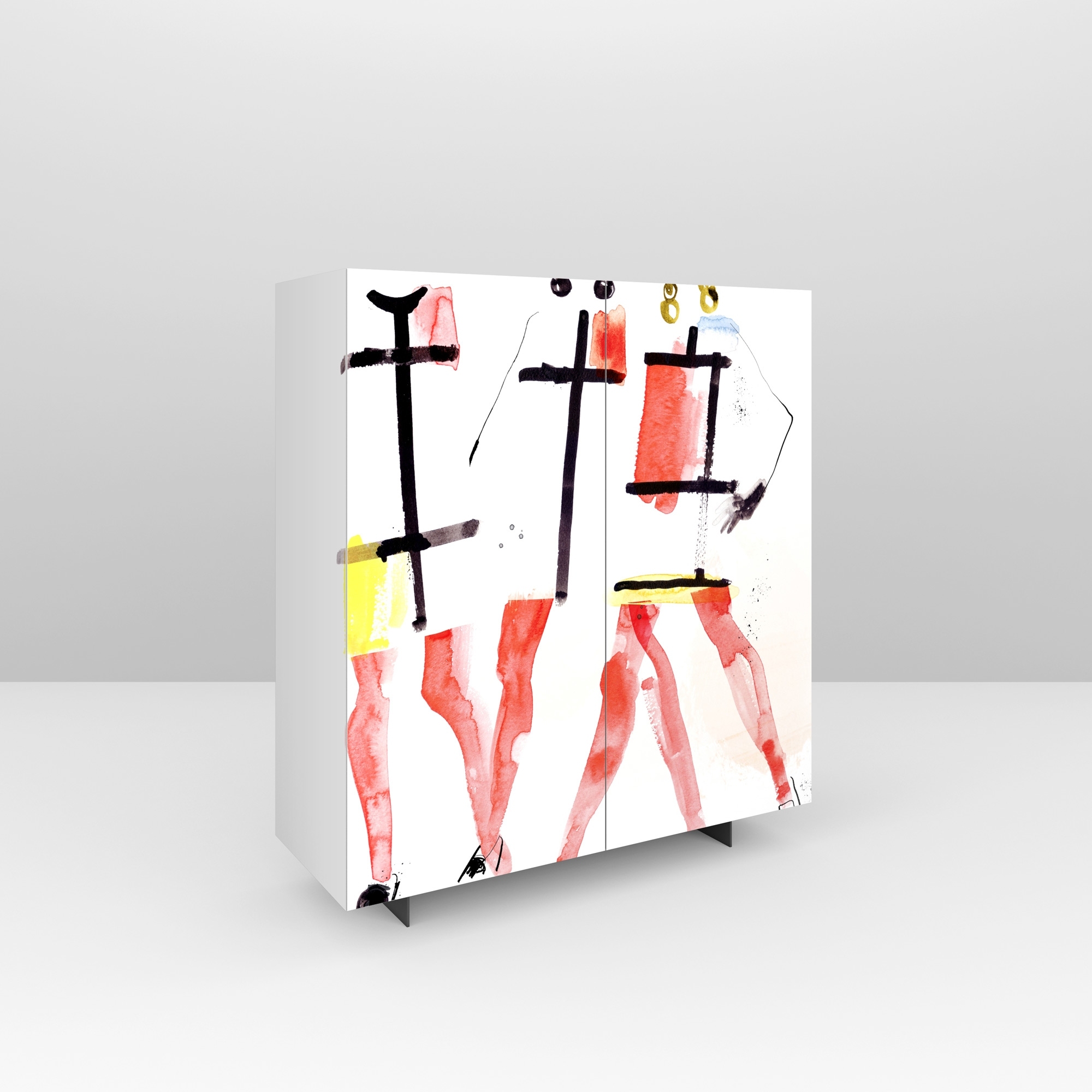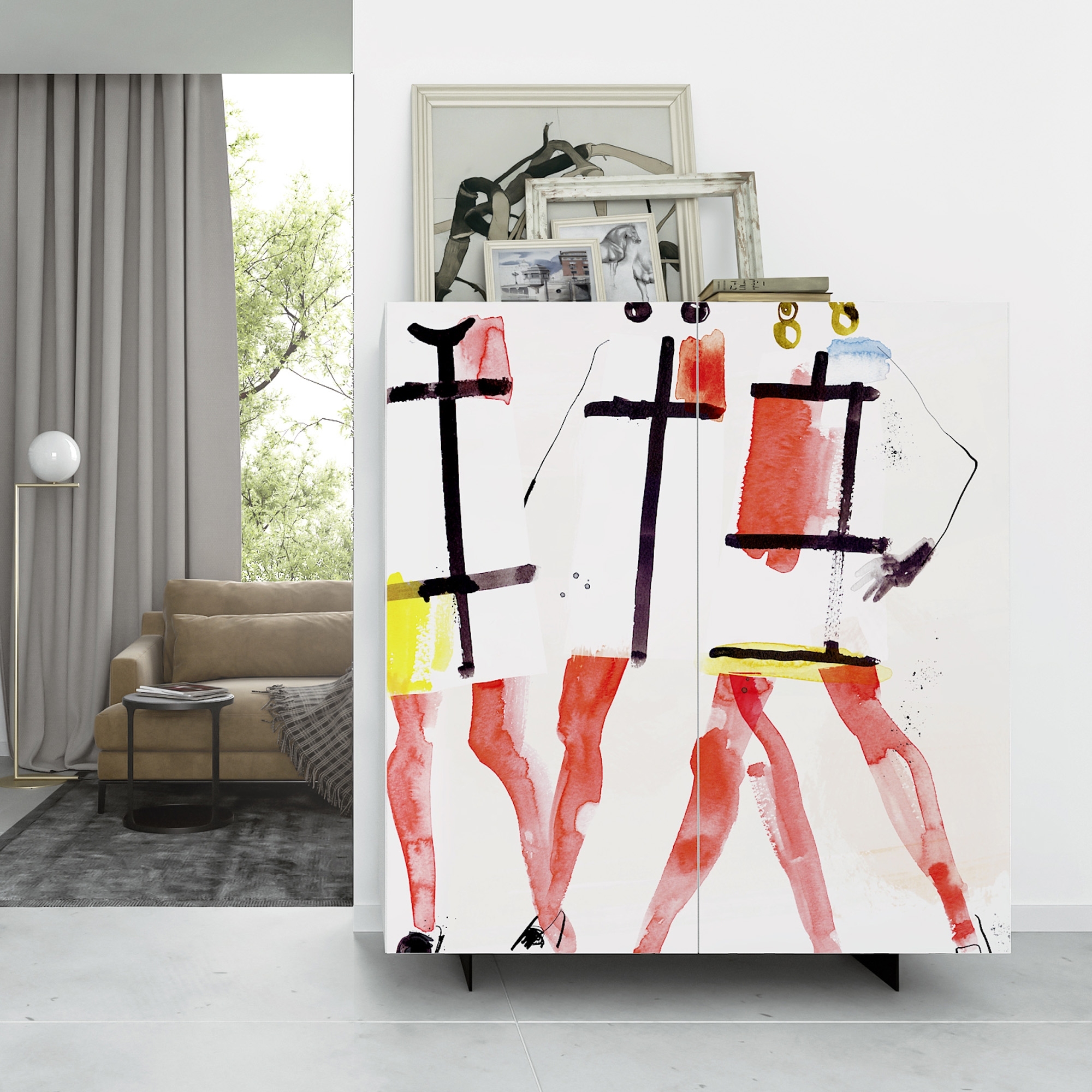 Sideboard with two doors from the 1960 line made of lacquered wood with metal base with graphite gray finish, MDF doors and digitally printed graphics with protective water-based varnish. Perfect in a modern and carefree living area, the sideboard is equipped with three practical shelves. Designed by Cinzia Zenocchini for Pictoom.