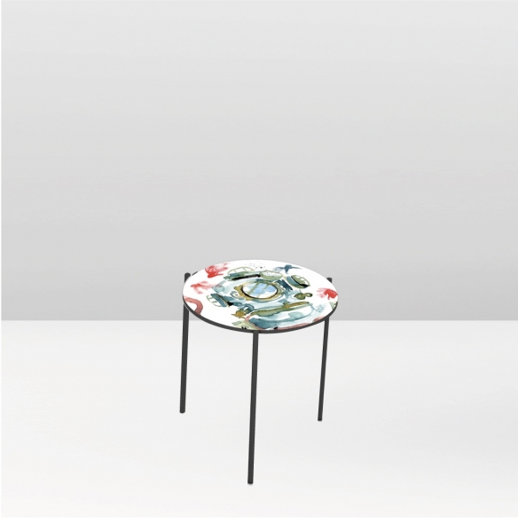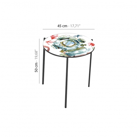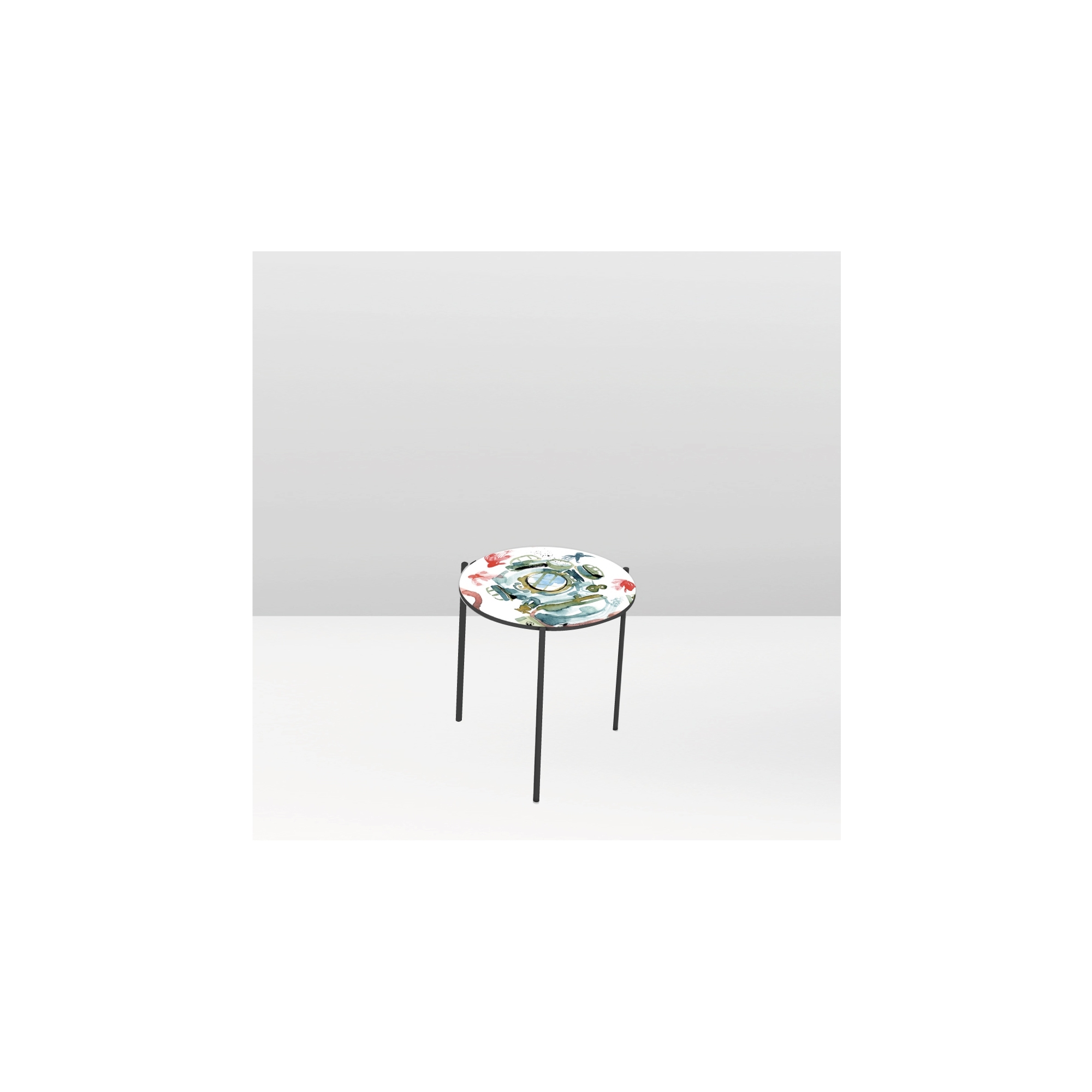Coffee table with a diameter of 45 cm from the Palombaro line with graphite gray painted metal structure, MDF top and digitally printed graphics with protective water-based paint. Perfect for redesigning your living room, the coffee table matches flawlessly with the sideboard of the same line for a fresh and playful decor. Designed by Cinzia Zenocchini for Pictoom.