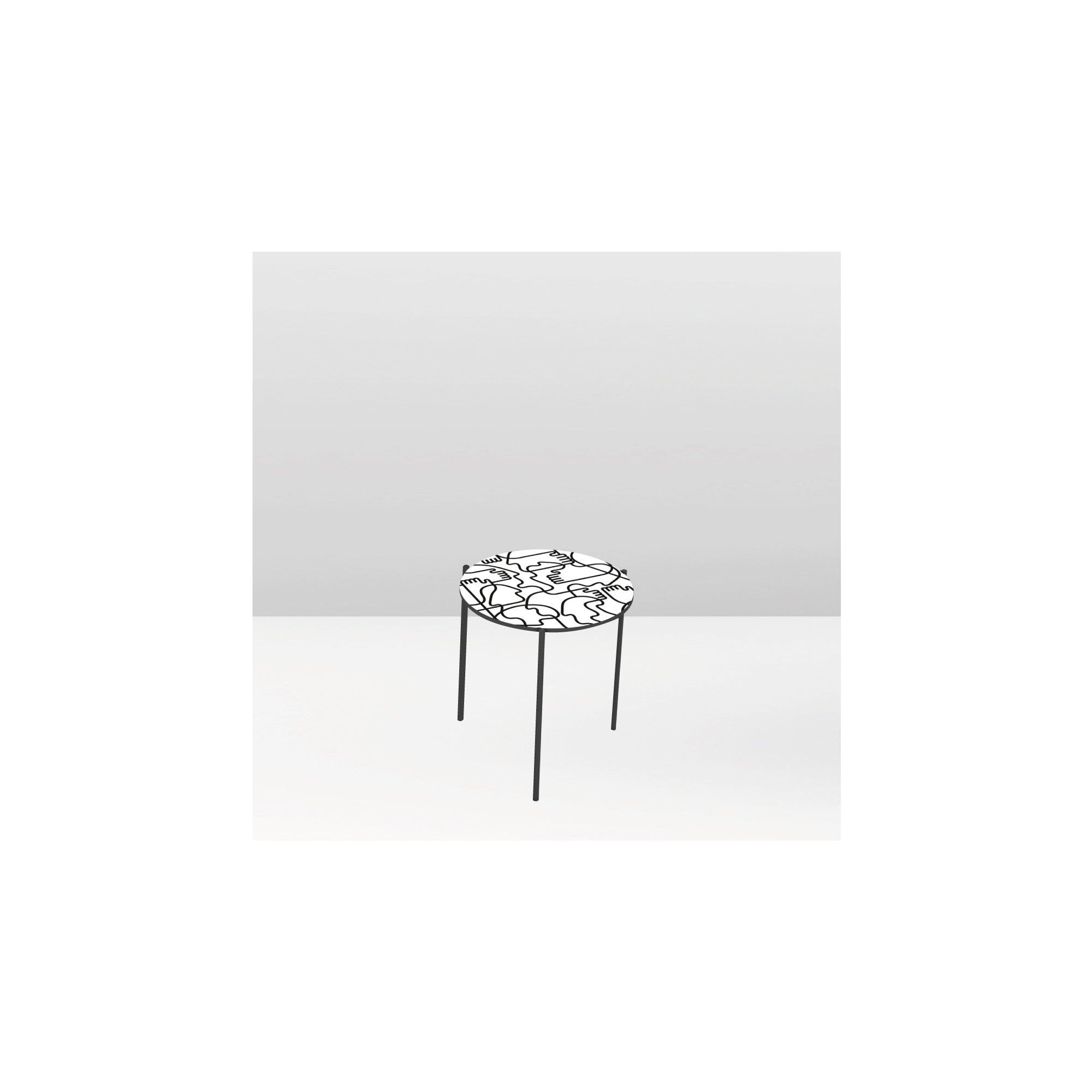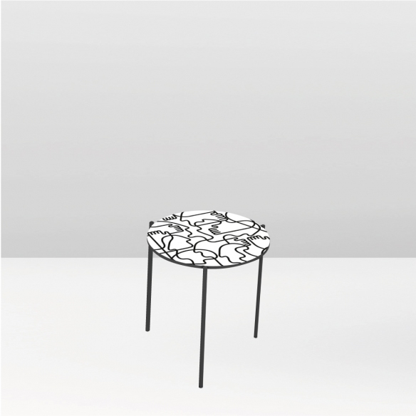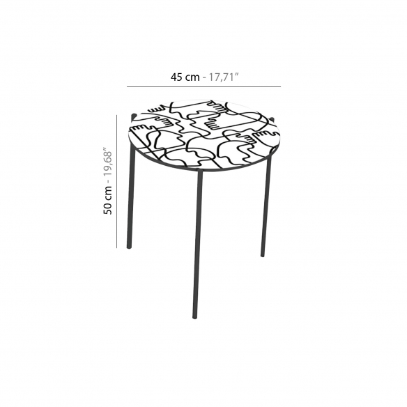 Coffee table with a diameter of 45 cm from the Shake Hands line with graphite gray painted metal structure, MDF top and digitally printed graphics with protective water-based paint. Perfect for redesigning your living room, the coffee table matches flawlessly with the sideboard of the same line for a fresh and playful decor. Designed by Jonathan Calugi for Pictoom.
