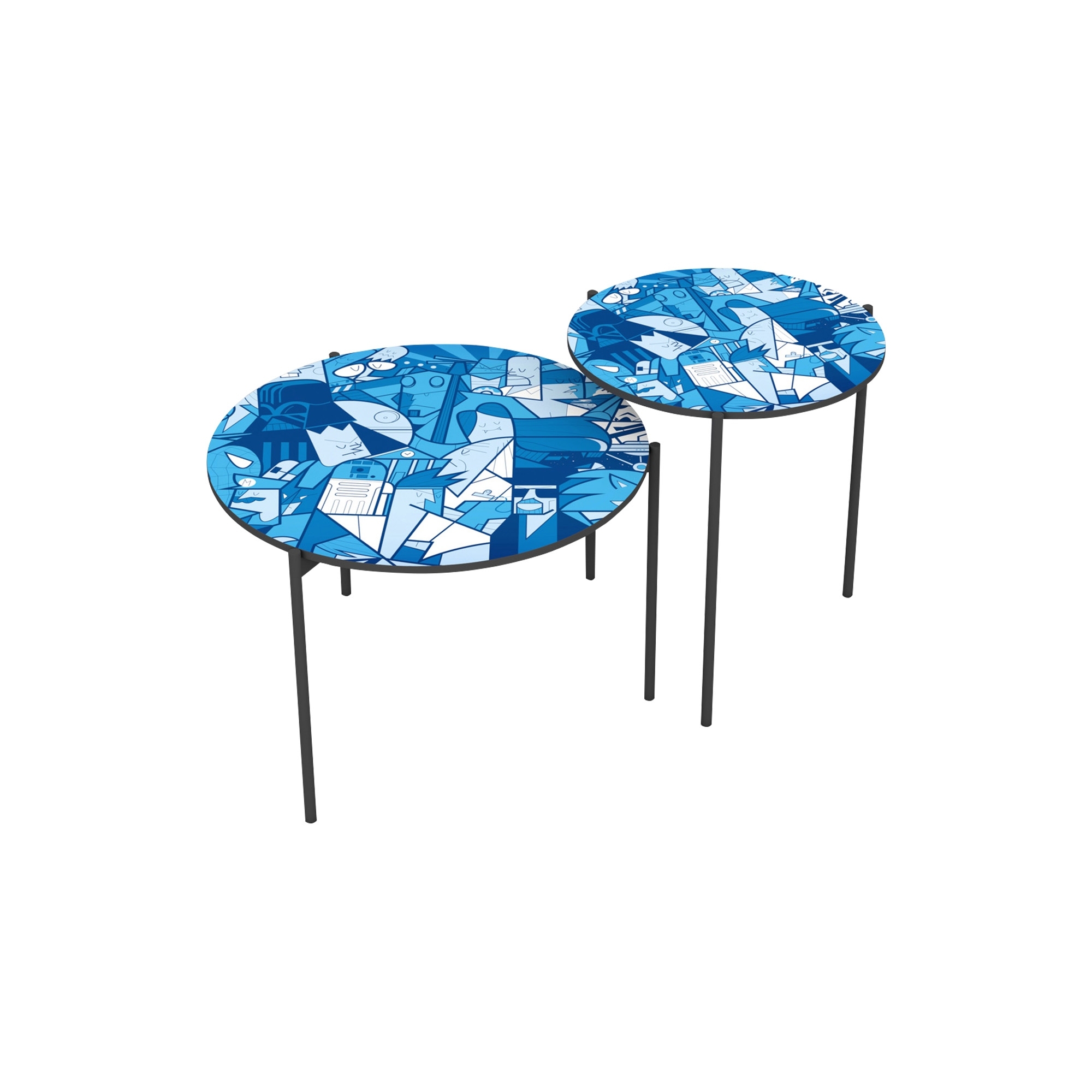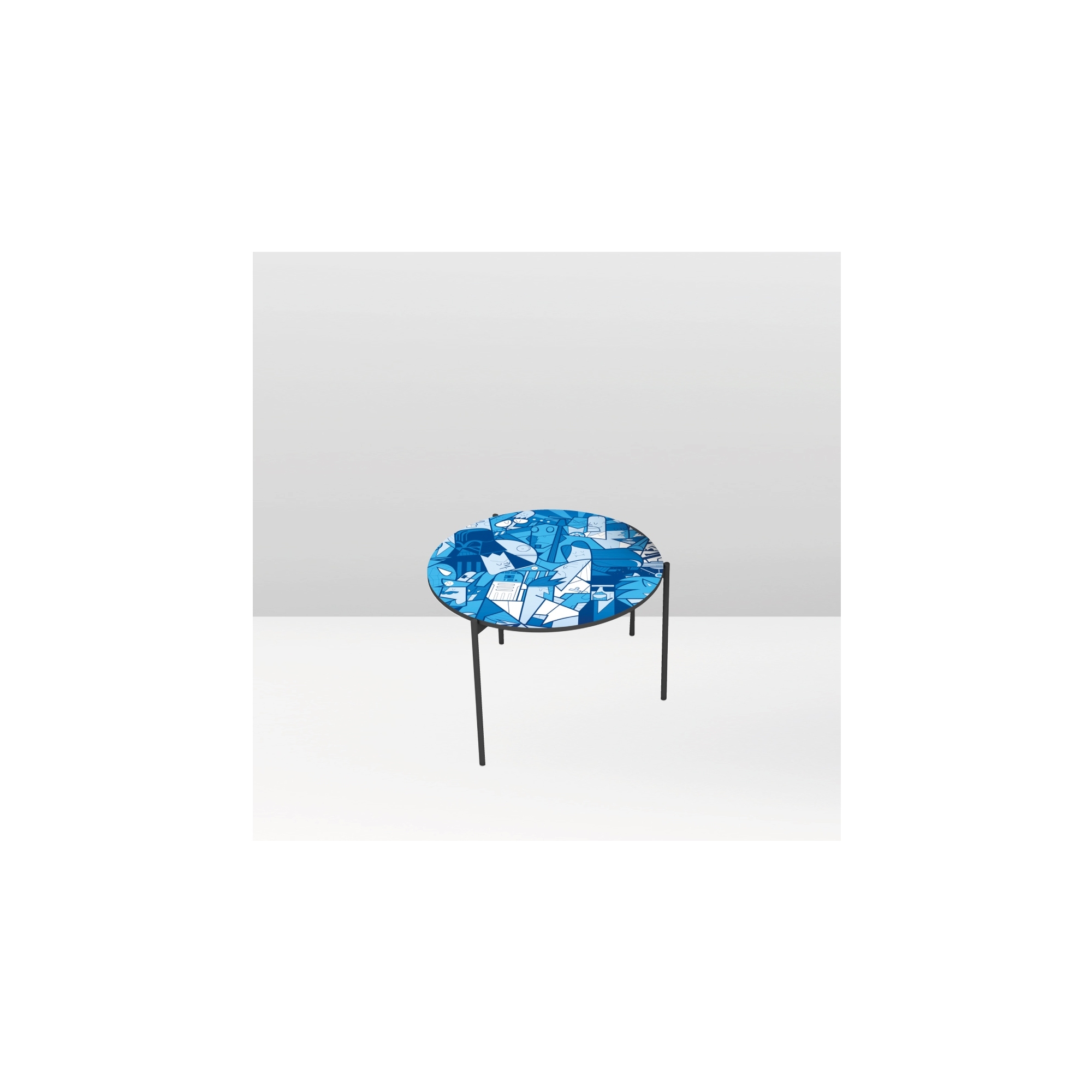 Coffee table with a diameter of 60 cm from the Melting Pop line with graphite gray painted metal structure, MDF top and digitally printed graphics with protective water-based paint. Perfect for redesigning your living room, the coffee table matches flawlessly with the sideboard of the same line for a fresh and playful decor. Designed by Ale Giorgini for Pictoom.