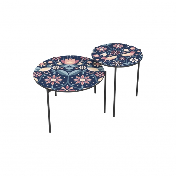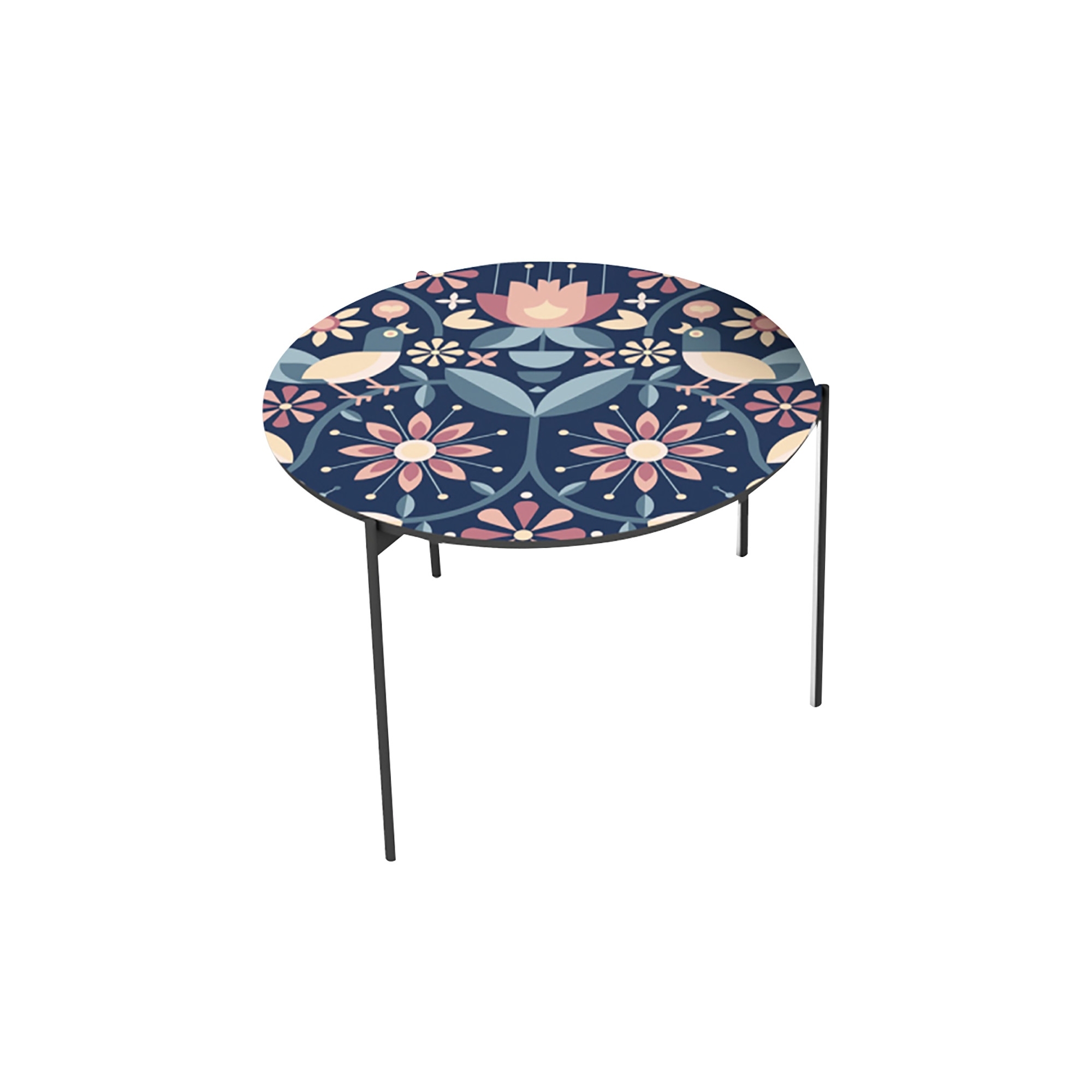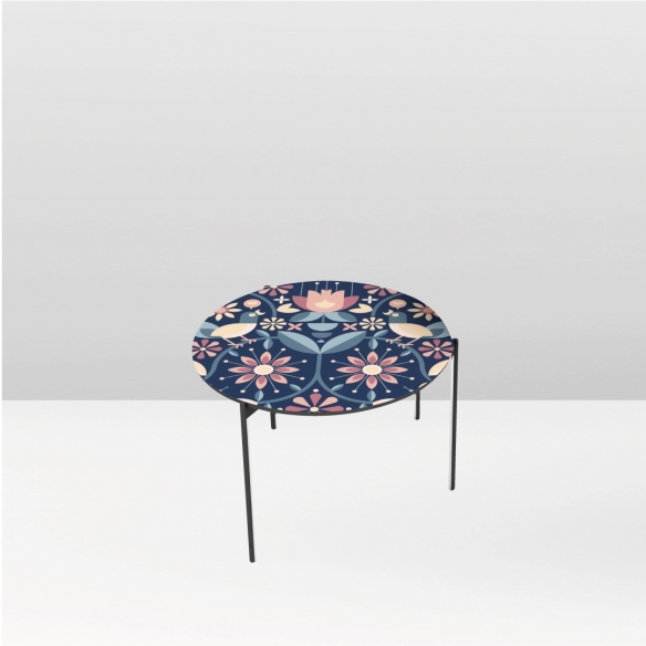 Coffee table with a diameter of 60 cm from the Modern Hippie line with graphite gray painted metal structure, MDF top and digitally printed graphics with protective water-based paint. Perfect for redesigning your living room, the coffee table matches flawlessly with the sideboard of the same line for a fresh and playful decor. Designed by Francesco Poroli for Pictoom.
