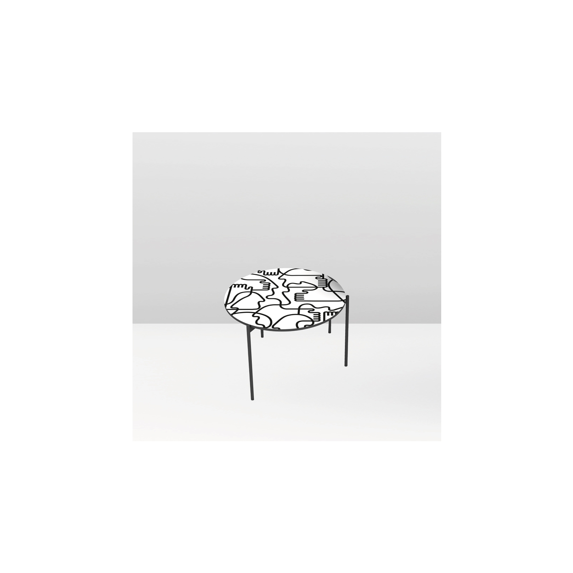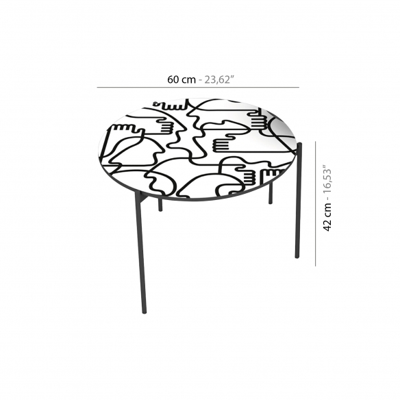 Coffee table with a diameter of 60 cm from the Shake Hands line with graphite gray painted metal structure, MDF top and digitally printed graphics with protective water-based paint. Perfect for redesigning your living room, the coffee table matches flawlessly with the sideboard of the same line for a fresh and playful decor. Designed by Jonathan Calugi for Pictoom.