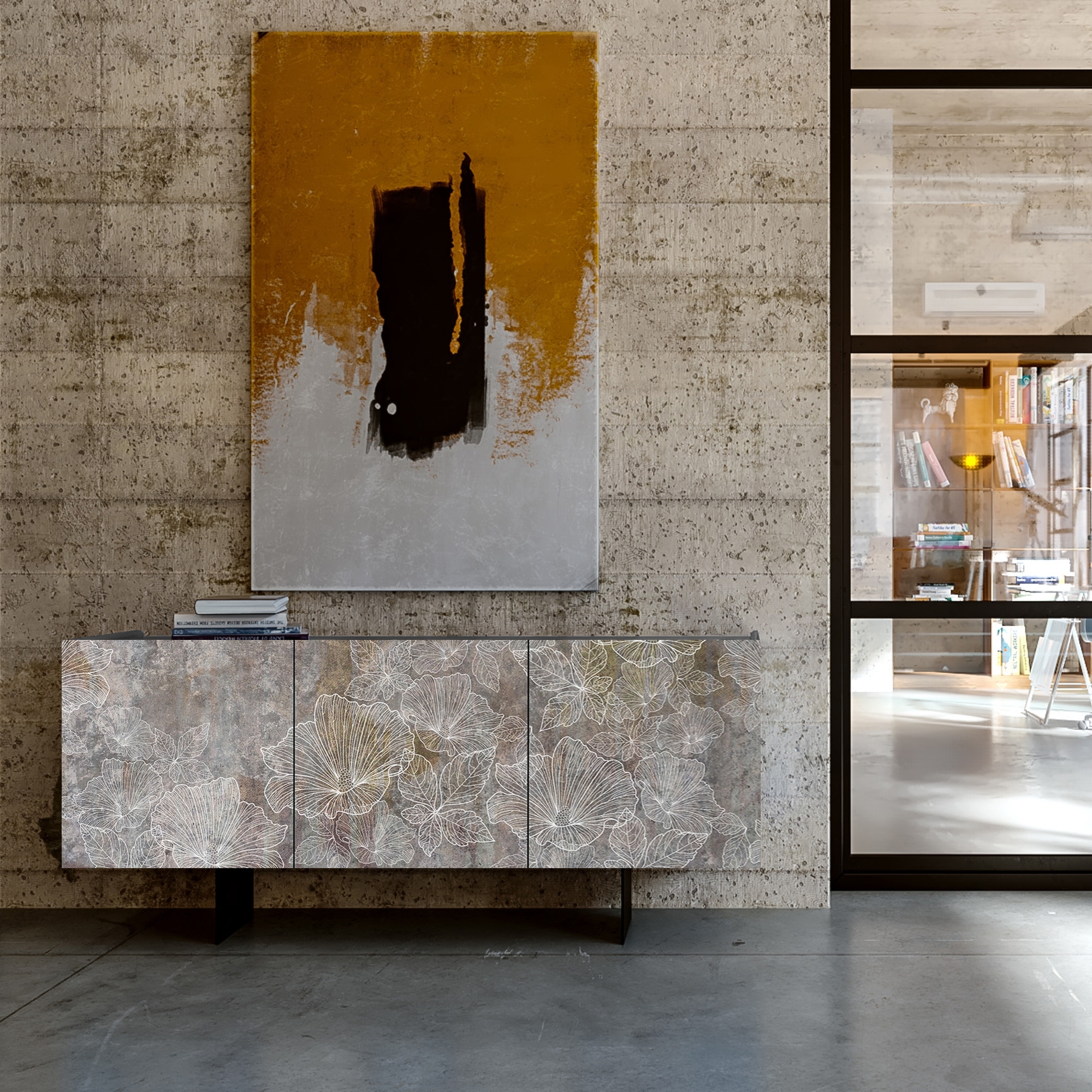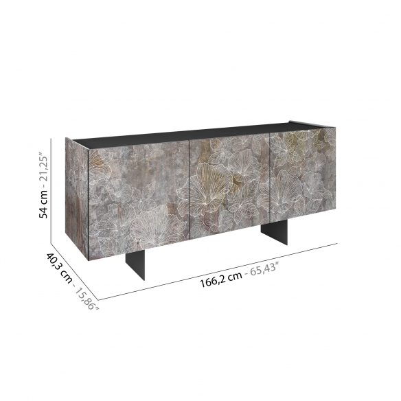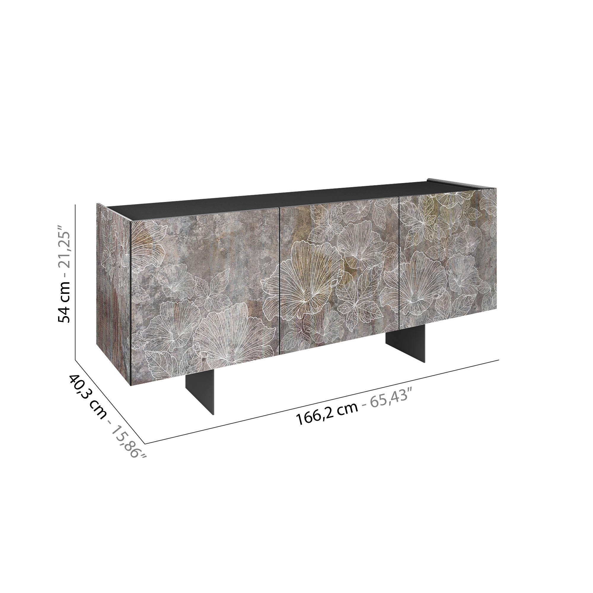 Sideboard with three doors from the Antique line made of lacquered wood with metal base with graphite gray finish, MDF doors and digitally printed graphics with protective water-based varnish. Perfect for furnishing a modern and carefree living area, the sideboard is equipped with practical shelves and perfect as a low piece on which to display decorative vases or various objects. Designed by Tiziano Sartori for Pictoom.