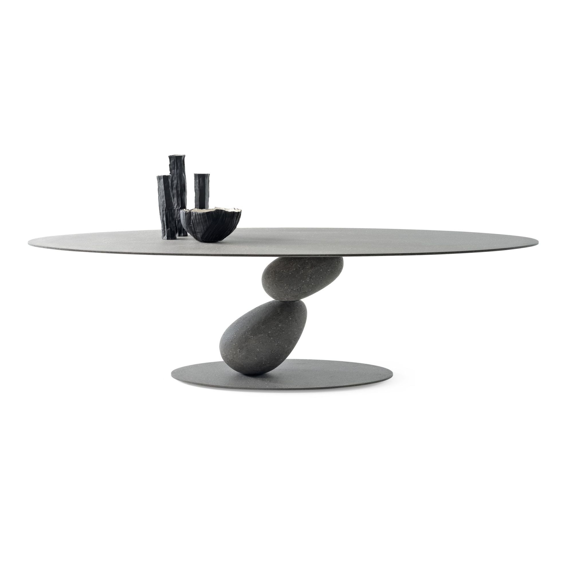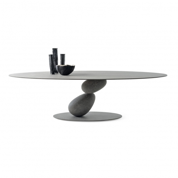 Matera oval table with metal structure and mdf top. It is covered in 3 hand-spatula textured finishes. With significant dimensions, the Matera table consists of two stones that support a top in a perfect game of balance and stability to furnish your living area with style. Designed by Sebastiano Tosi for Mogg.