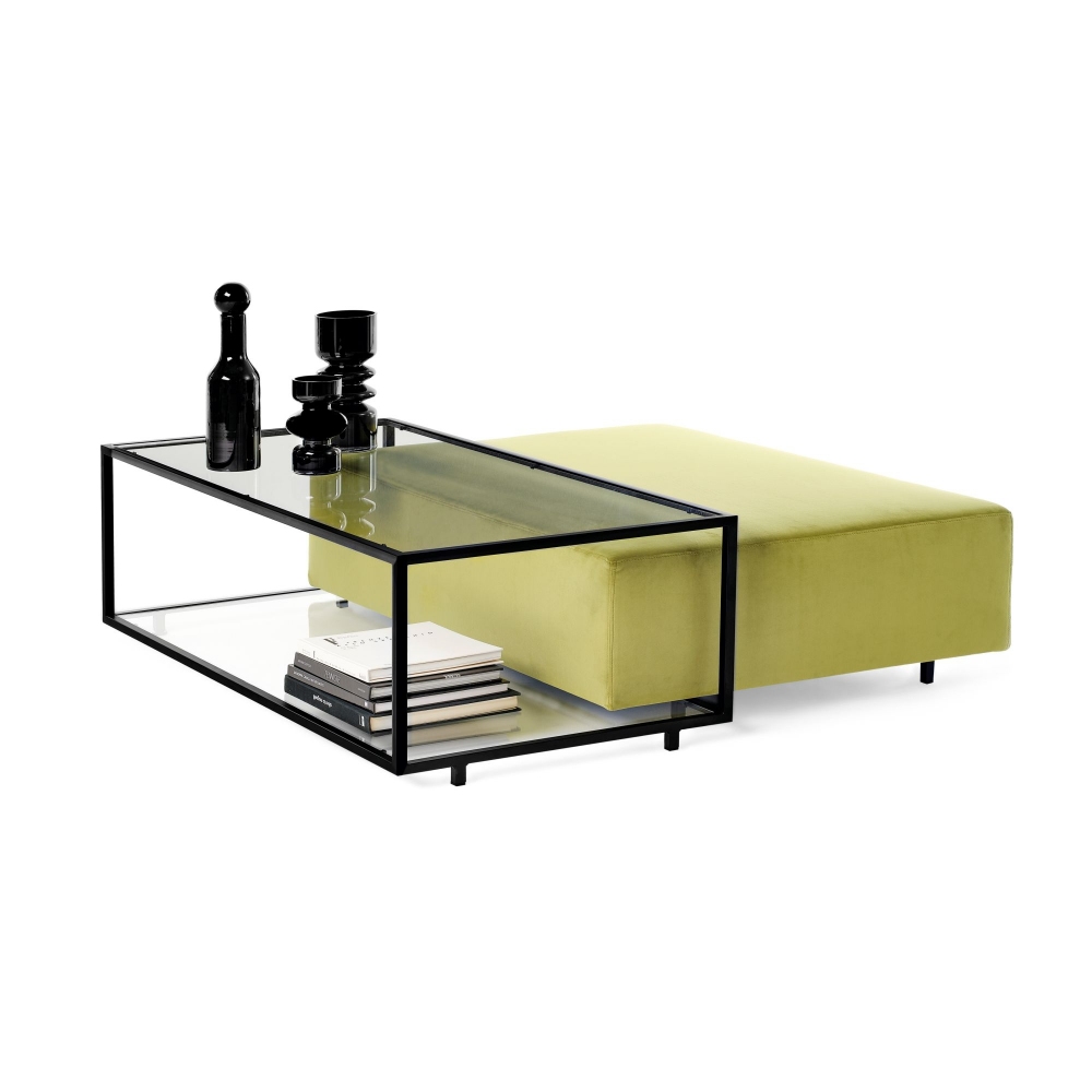 Zoom square pouf/coffee table with padded pouf seat with removable cover and a coffee table with metal structure available in patinated bronze or black painted finishes, and with transparent glass top. A classic piece of furniture with a timeless style, ideal in the living area as a seat and at the same time as a table to place any object. Designed by Uto Balmoral for Mogg.