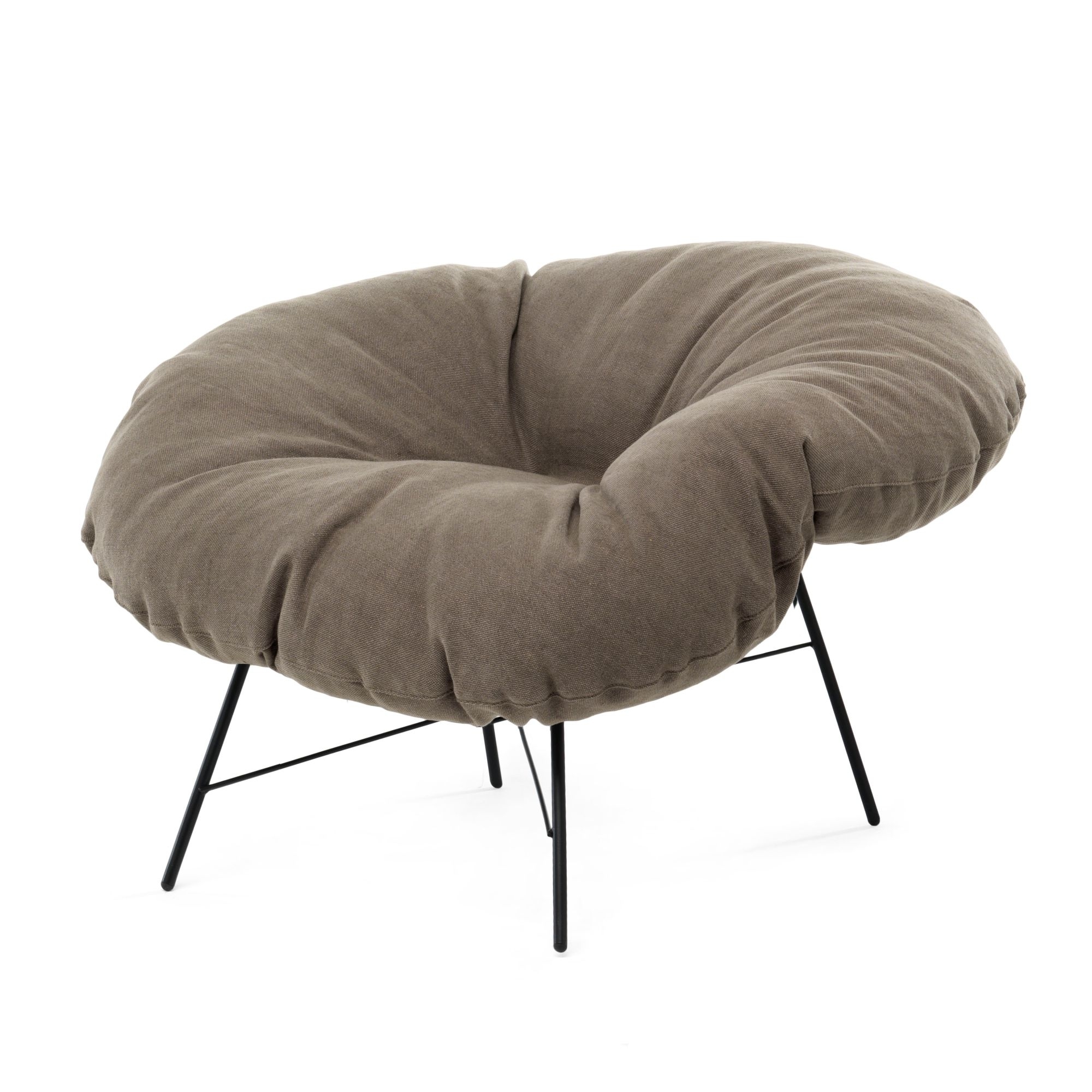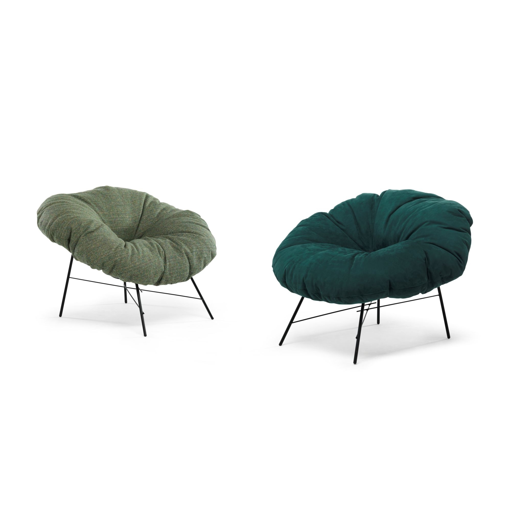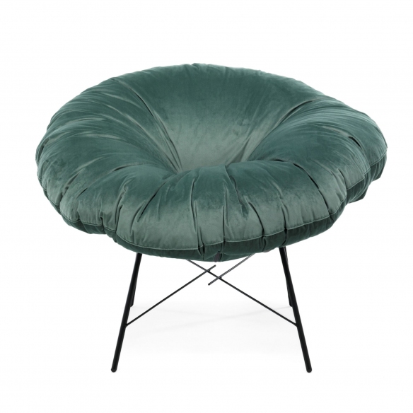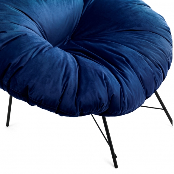 Closer armchair with matt black painted iron frame and feather cushion with removable velvet or cloth cover. Perfect for the living area or a modern and design office, the armchair has a light and essential but supportive base while the seat has generous shapes and resembles a comfortable and cuddly cushion that offers maximum comfort. The colors and textures of the fabrics contribute to the originality of Closer. Designed by Dainelli Studio for Mogg.