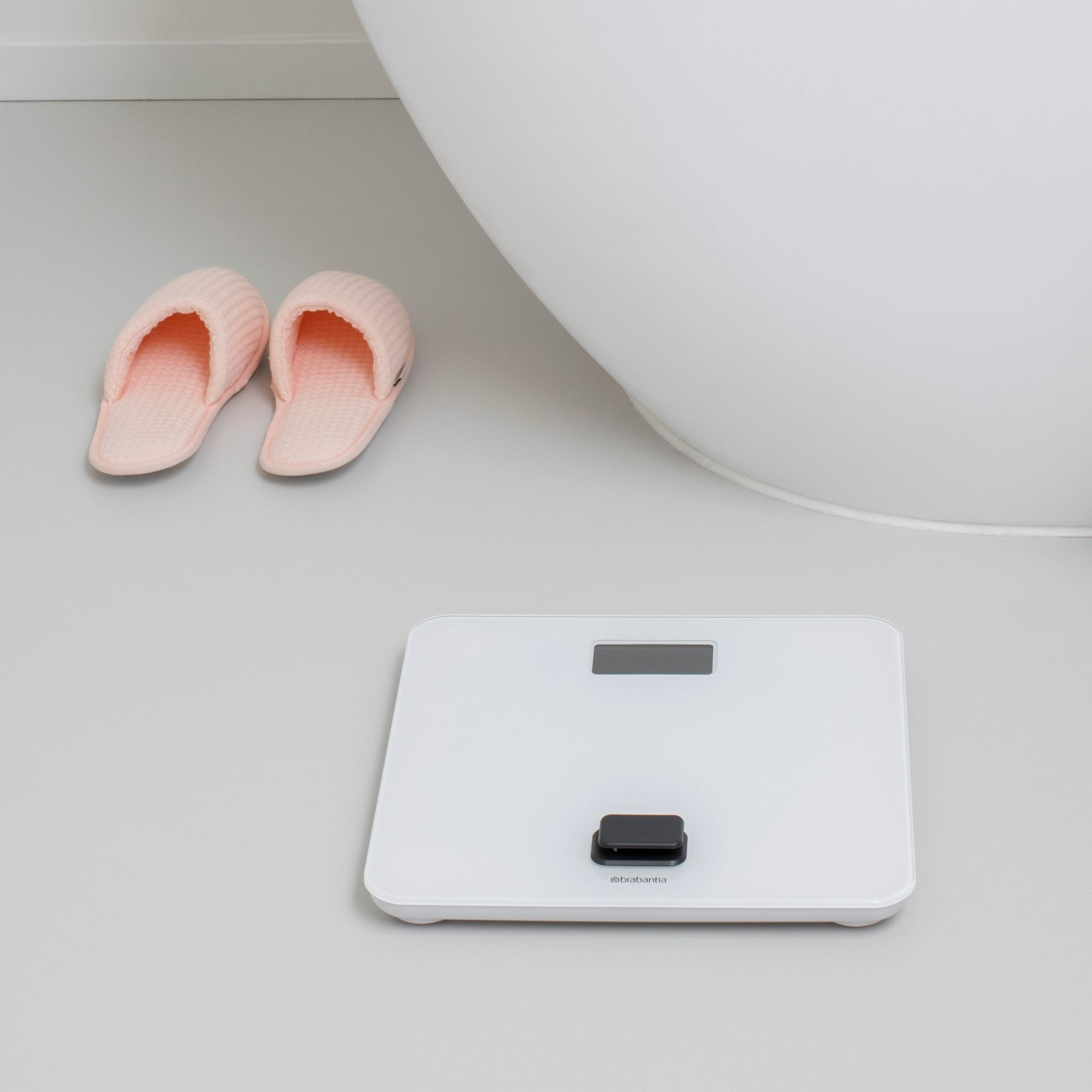 Personal scale from the ReNew collection, made of thermoplastic resin and glass surface. Available in three elegant finishes, the ReNew bathroom scale does not require batteries, thanks to the automatic control for power generation. Compact and elegant, the ReNew scale can support a weight from 5 kg up to 150 kg. To turn it on, simply press the appropriate button. Easy to clean and eco-friendly! Made by Brabantia.