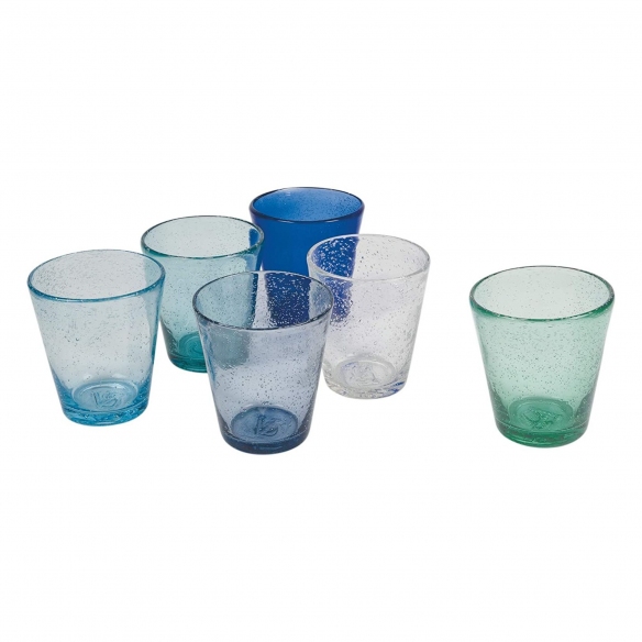 6 water glasses from the Cancun Marea line with a capacity of 33 cl made of colorful blown glass paste. The glasses are suitable for washing in the dishwasher. Made by Villa D'este Home Tivoli.