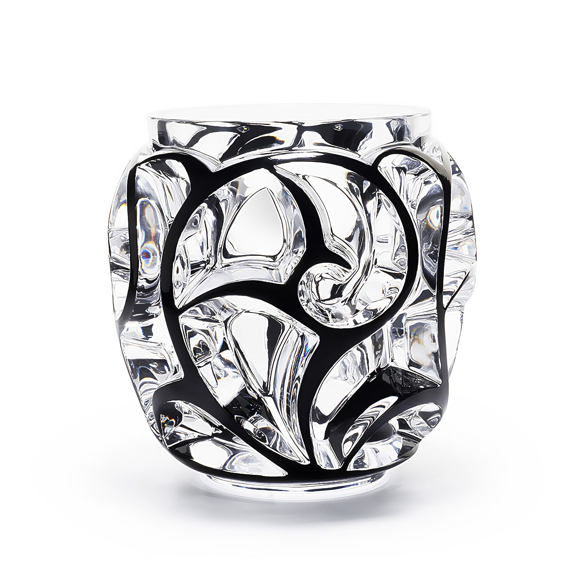 Tourbillons XXL vase "Clear Black Enamelled" finish made of crystal. Featuring a bright and vibrant design, the Tourbillons vase features a motif inspired by the flowering of a fern, a plant that symbolizes life and movement. The quality of the crystal can be seen in its ability to reflect light, creating extremely romantic depth effects. Designed by René Lalique.