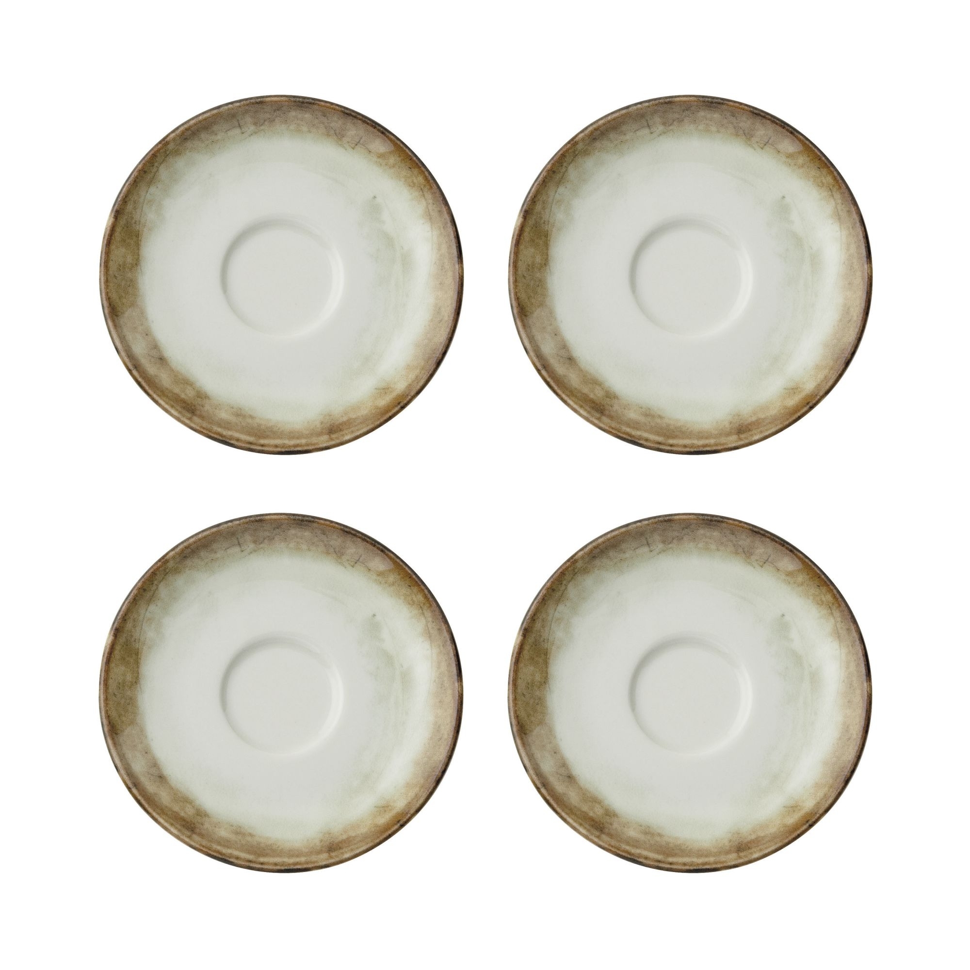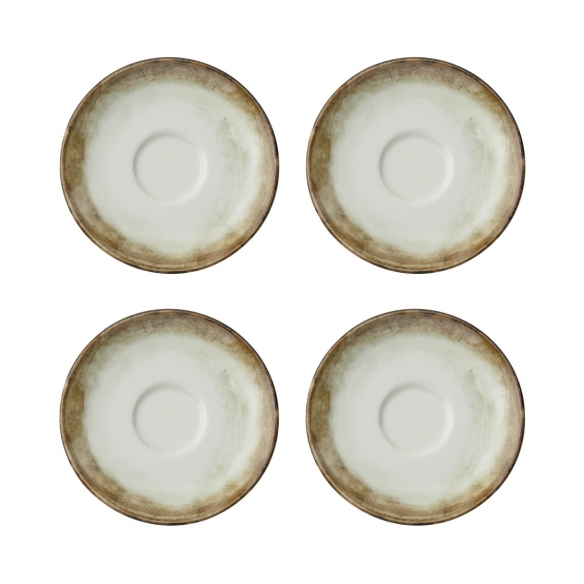 Set of 4 coffee saucers with a diameter of 12 cm, belonging to the Shade Earth collection, made of fine decorated porcelain. Each saucer is characterized by trendy shades, the brownish edge creates a fantastic contrast with the white, generating a pleasant optical effect, deliberately imprecise. Perfect for outdoor or casual-chic locations, Shade Earth saucers offer your table style, quality and timeless elegance. These saucers are dishwasher safe. Made by Arthur Krupp.